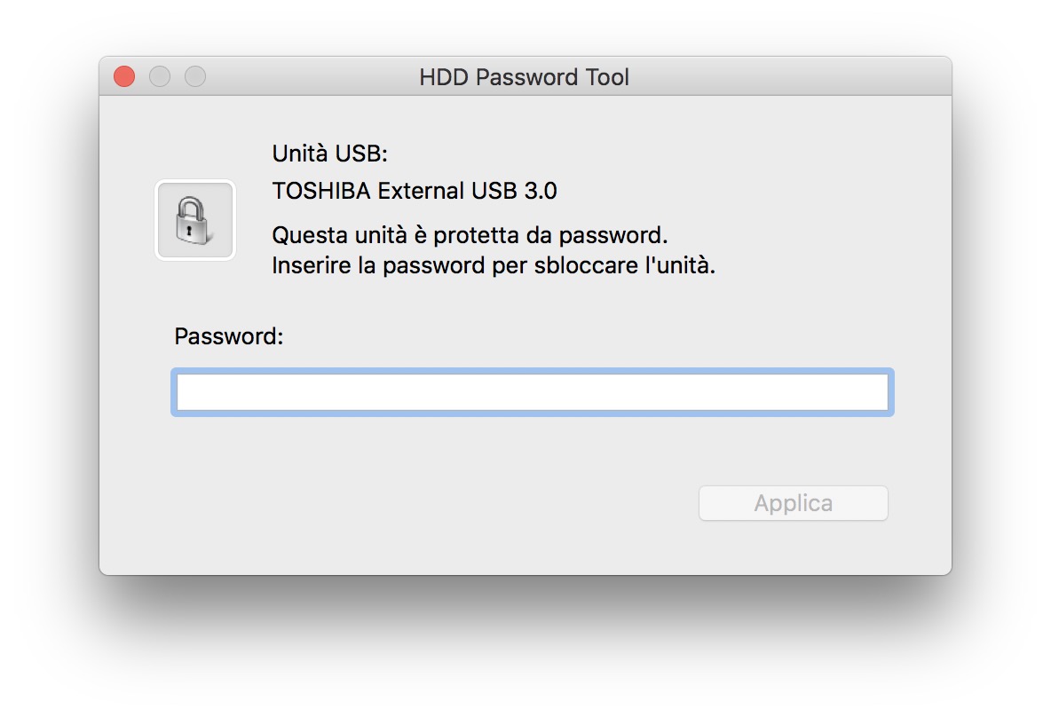 Quello che fa Toshiba con questo Canvio Premium for Mac è sostanzialmente anteporre un lucchetto digitale che è necessario per accedere al disco, senza il quale (e senza la password) il disco è in pratica illeggibile.