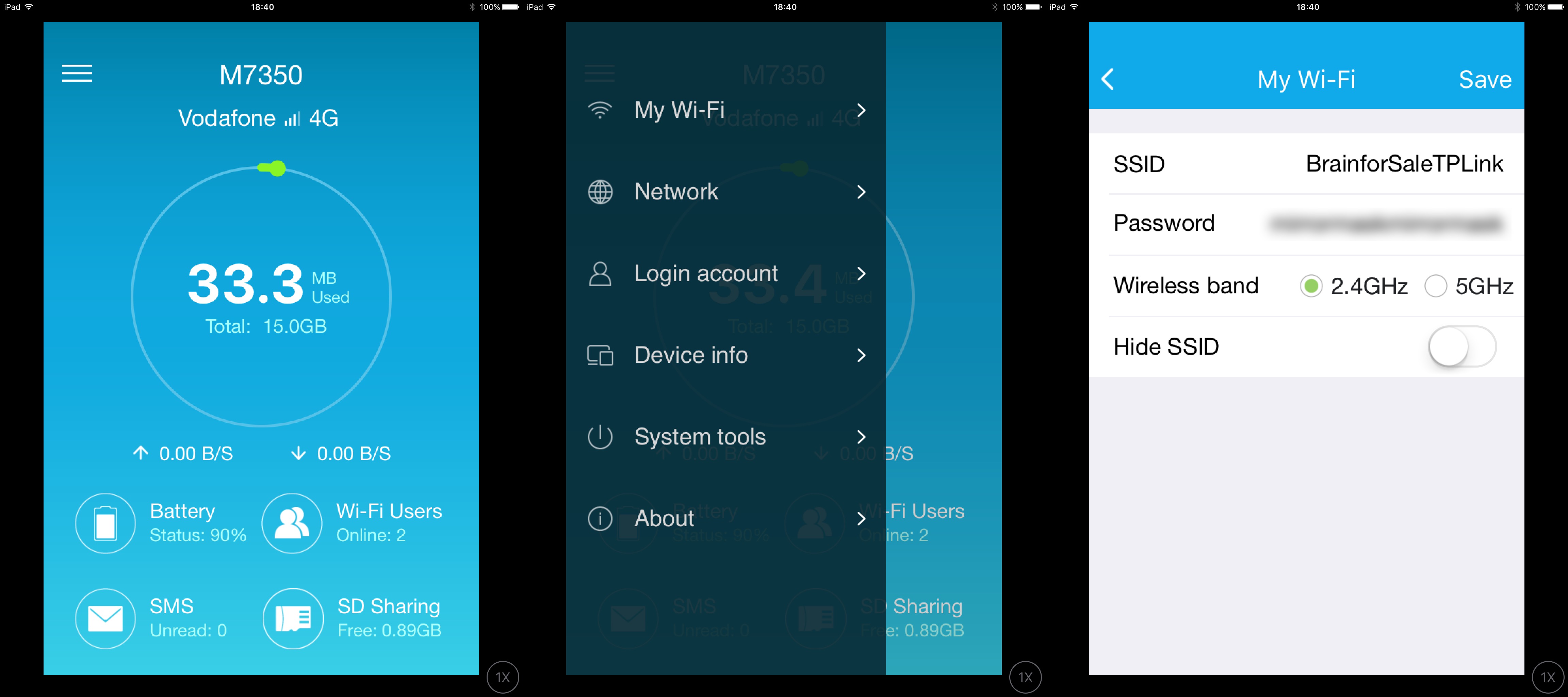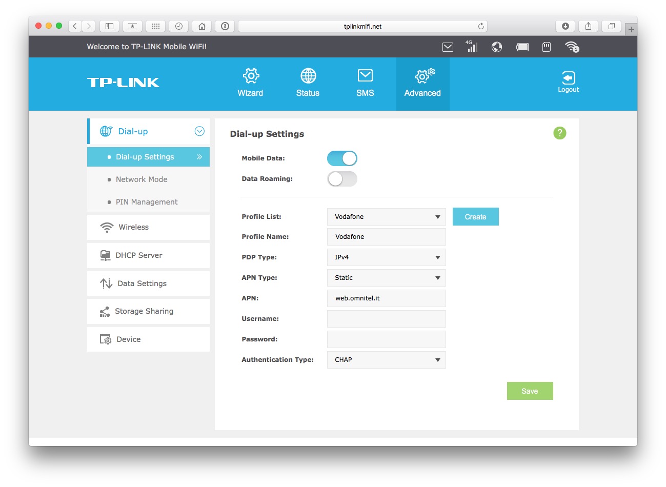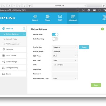 Ovviamente il TP-Link è pensato per adattarsi a tutti gli operatori, che a loro volta sono tenuti a dare i dati essenzali per il funzionamento (nel nostro caso, il servizio assistenza di Vodafone è stato molto gentile, ad ogni modo l’unico dato importante è l’indirizzo APN che per l’Italia è web.omnitel.it, come si può vedere negli screen sotto). L’M7350 dispone di una doppia banda di frequenza, a 2,4 e 5 Ghz, selezionabile a piacere dall’utente nelle impostazioni, che sono tutte gestibili sia attraverso la pagina web tplinkmifi.net sia attraverso l’App tpMiFi.
