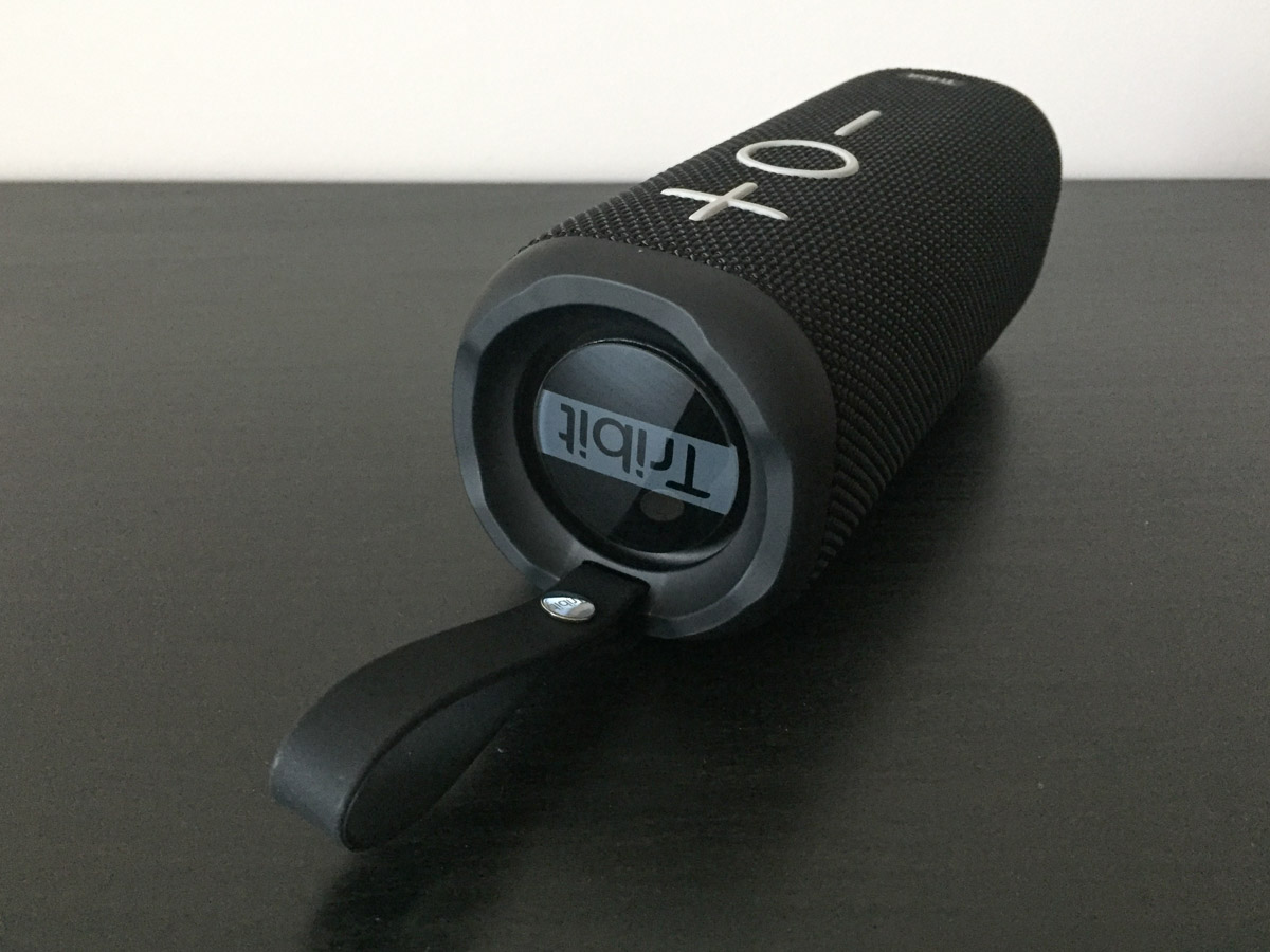 Come dicevamo la forma di Tribit MaxBoom è simile a quella di una borraccia, con lati piatti ma fortemente stondati agli angoli. Le due basi circolari sono irrobustite da una sporgenza in gomma che distanziano i due radiatori passivi, caratterizzati da una piastra in plastica lucida che vibra al suono delle basse frequenze. In uno di questi è già agganciato un robusto laccio di misura non regolabile: anche questo in gomma, per via delle sue ridotte dimensioni al suo interno non passa il polso ma piuttosto un paio di dita oppure il manubrio di una bicicletta. Eventualmente vi si potrebbe agganciare pure un moschettone.