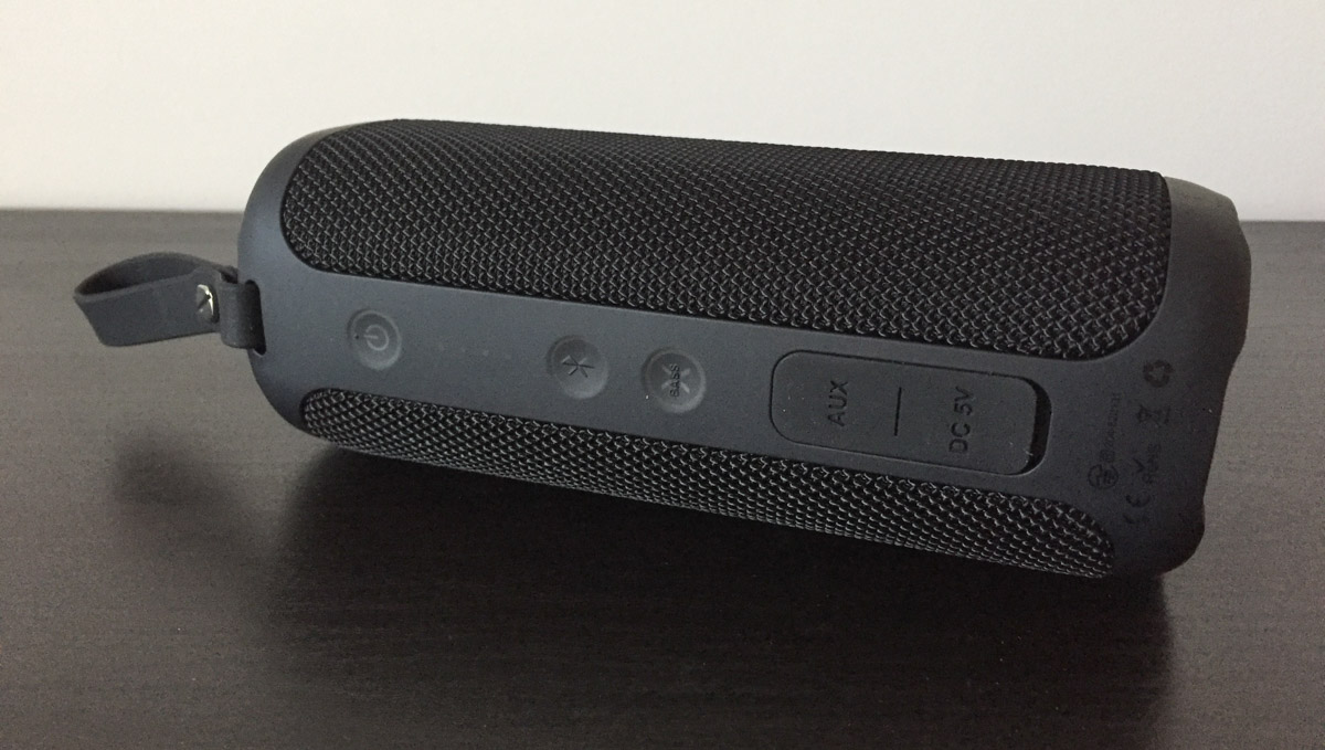 A dare nell’occhio sono soprattutto i pulsanti principali per il controllo della riproduzione musicale “+”, “o”, “-”, molto grandi e in contrasto con il resto dello speaker per via della colorazione grigio chiara. Dal lato opposto sono invece piuttosto mimetizzati quelli per l’accensione e lo spegnimento della cassa, il tasto Bluetooth e quello per attivare o disattivare la funzione Xbass. Qui c’è anche uno spesso tappo in gomma che protegge da polvere e infiltrazioni d’acqua la presa jack audio da 3.5 mm e l’ingresso microUSB per la ricarica della batteria.
