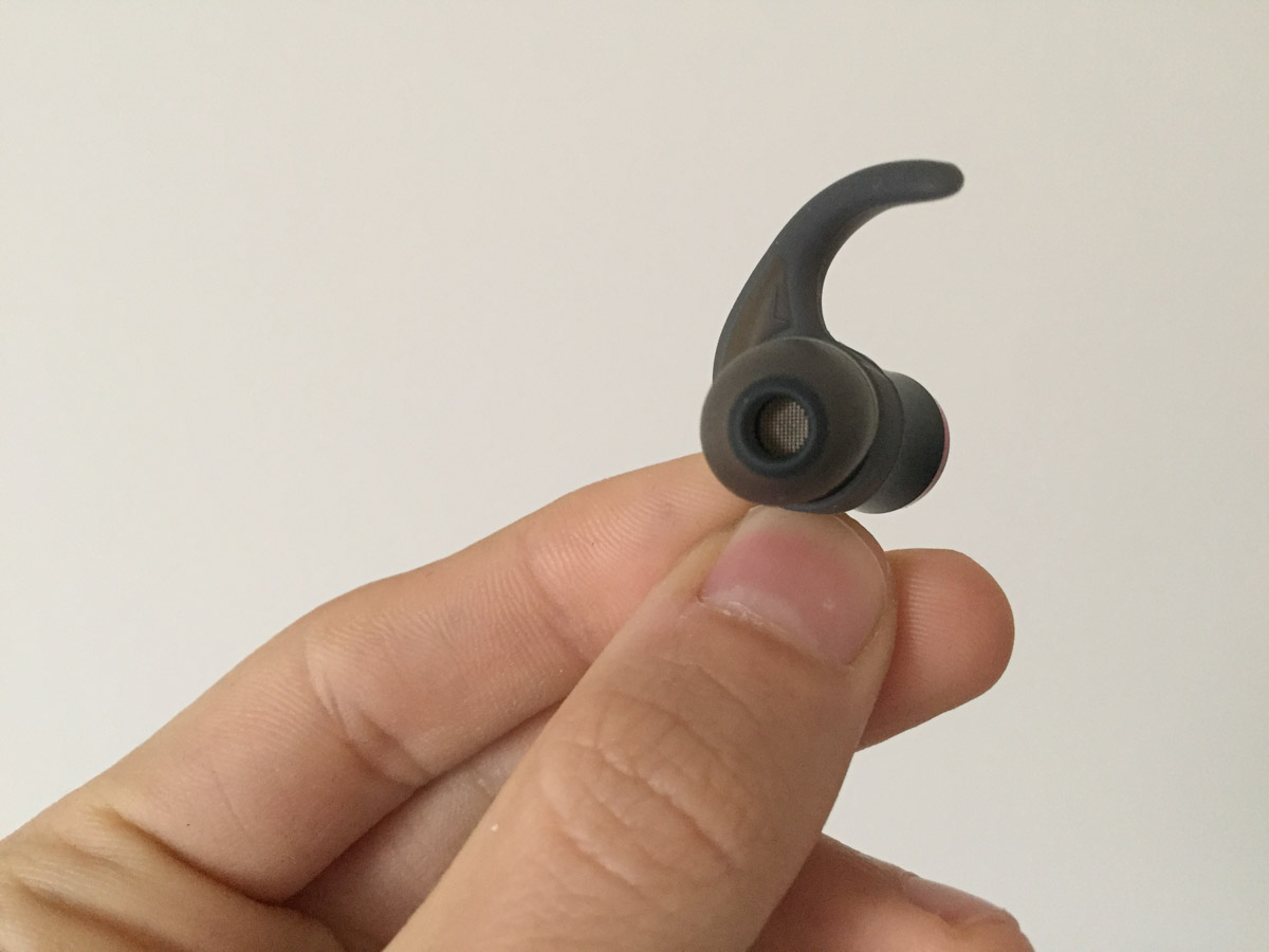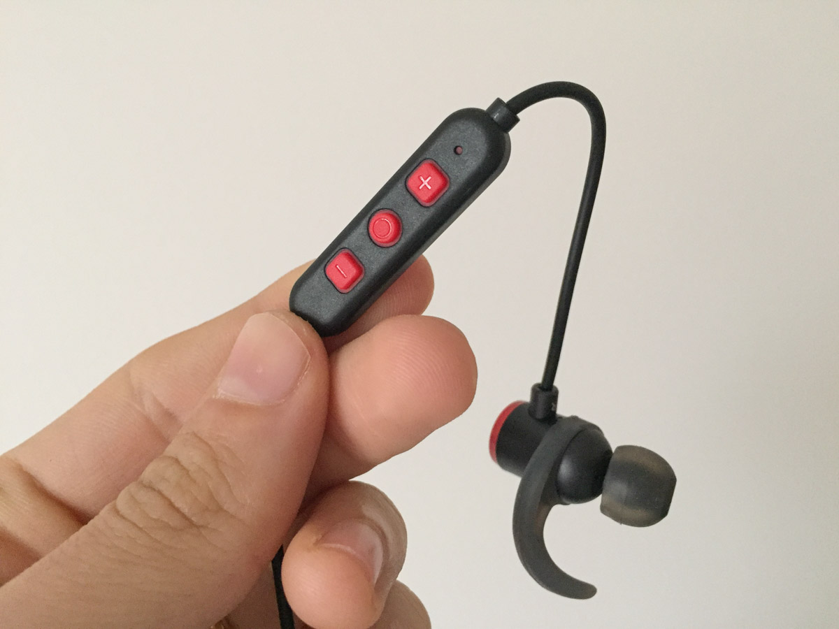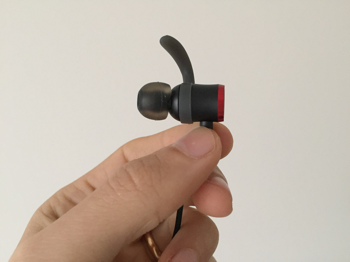 Gli auricolari sono esteticamente molto simili ad altri della stessa tipologia. Sono collegati tra loro da un cavo con guaina in gomma lungo circa 50 centimetri, mentre in prossimità dell’auricolare destro trova posto il telecomando, in plastica satinata. Dalla forma stondeggiata ai lati, è piuttosto grande ed accoglie tre pulsanti, quello multifunzione e i due tasti dedicati alla regolazione del volume ed alla gestione delle tracce audio (ma non solo) di colore rosso. Sul retro è invece presente il foro per il microfono mentre lungo un bordo è incassata la presa microUSB, ben protetta da un tappo in gomma che tiene lontano acqua e sudore.