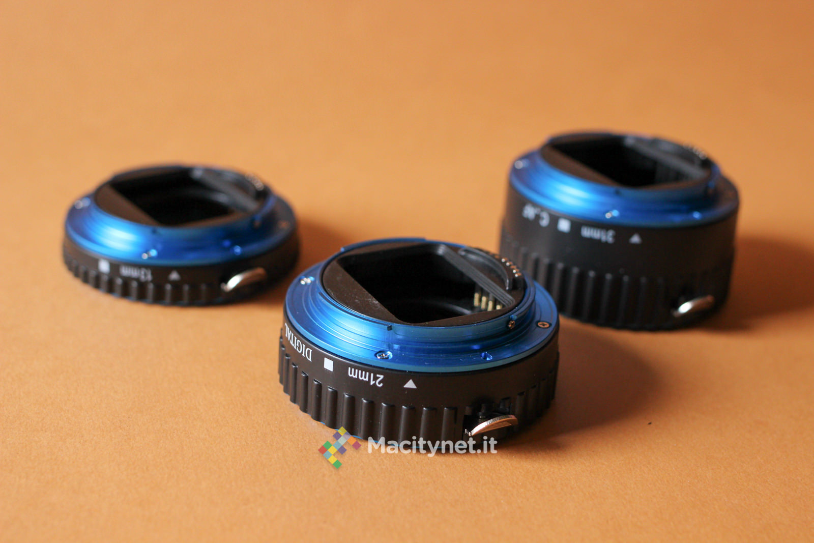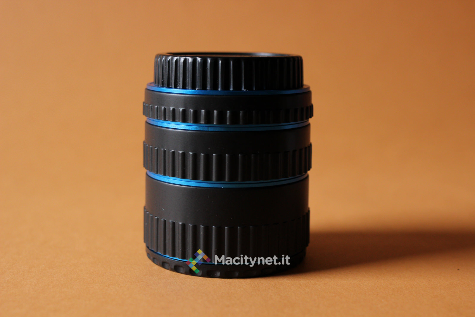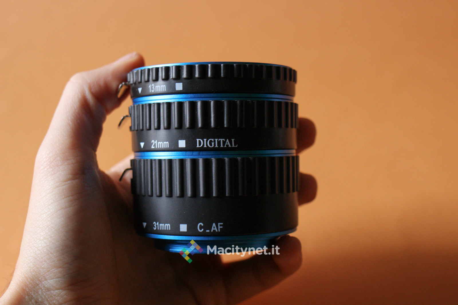 Il set di tubi (13 + 21 + 31 mm) di prolunga Andoer, specifici per Canon, sono in vendita su Amazon a 42 euro e la spedizione è compresa nel prezzo in tre varianti di colore dell’alluminio: blu, come quella dei nostri test, rossa e argento.
