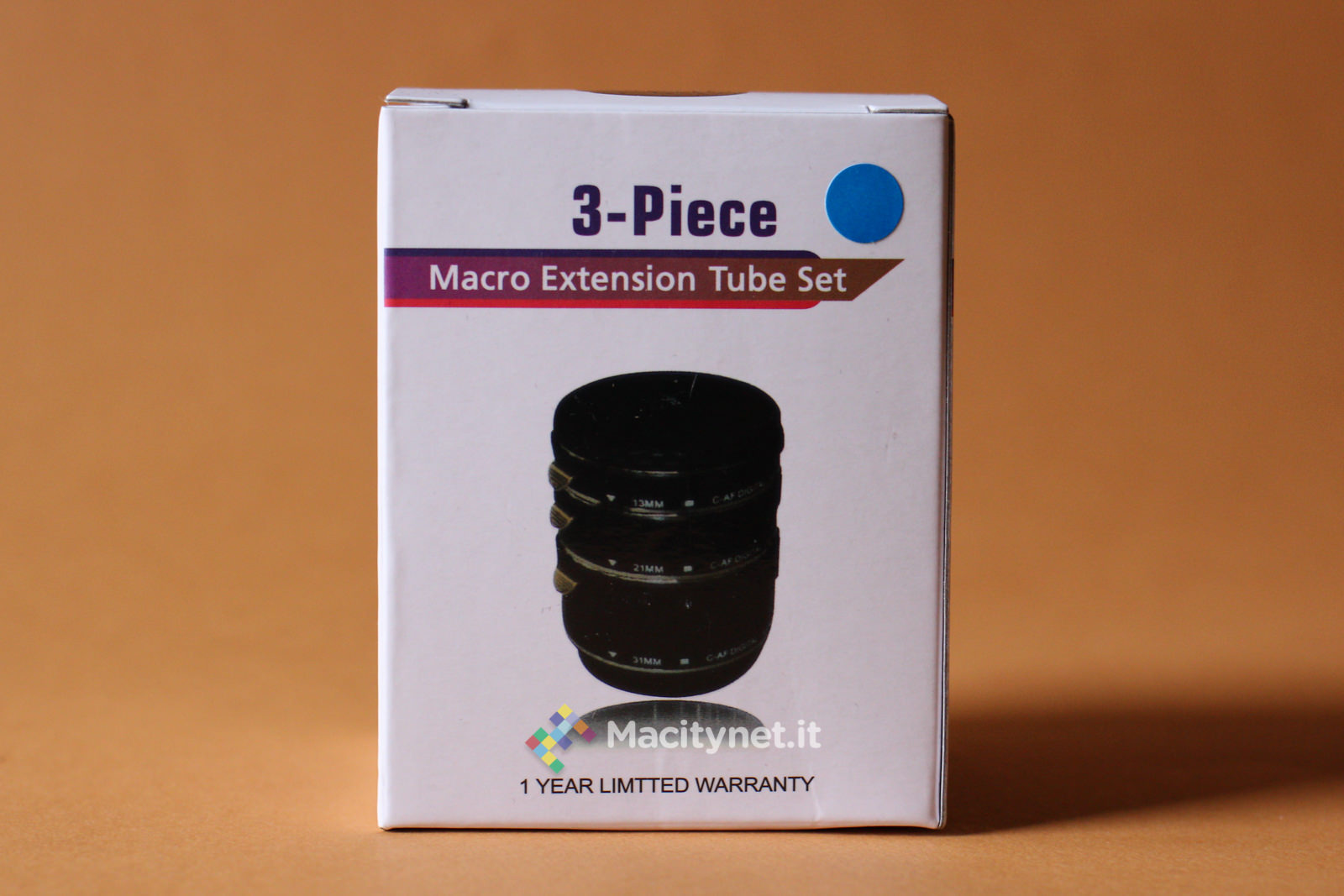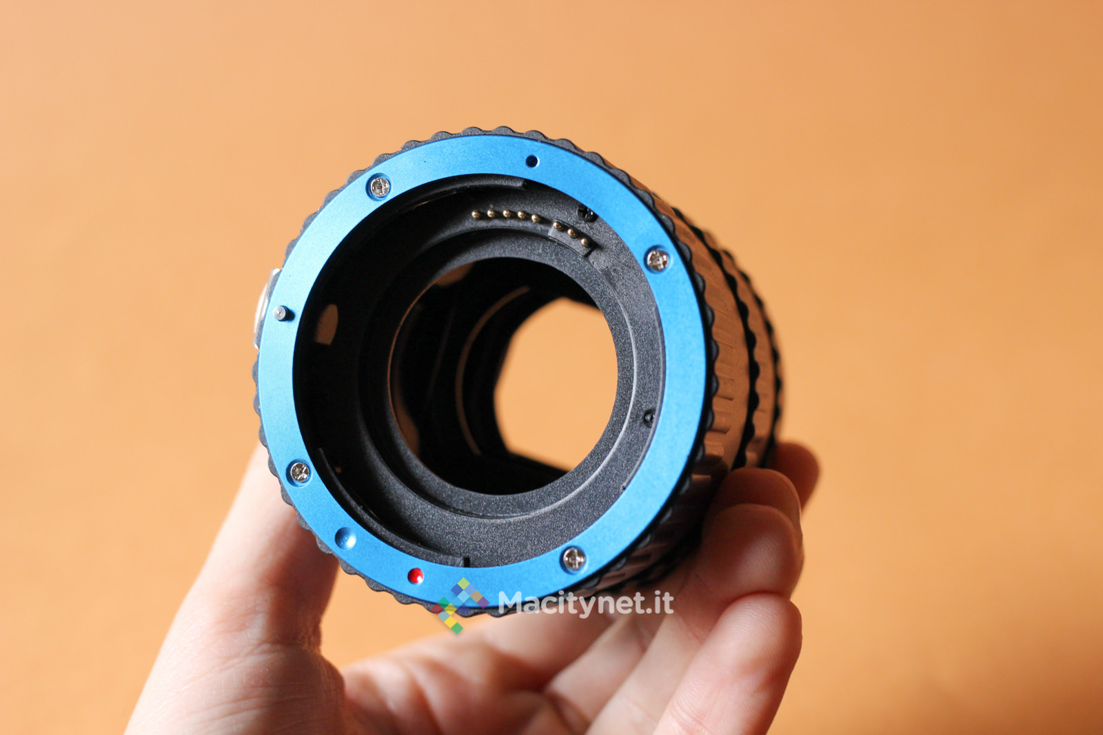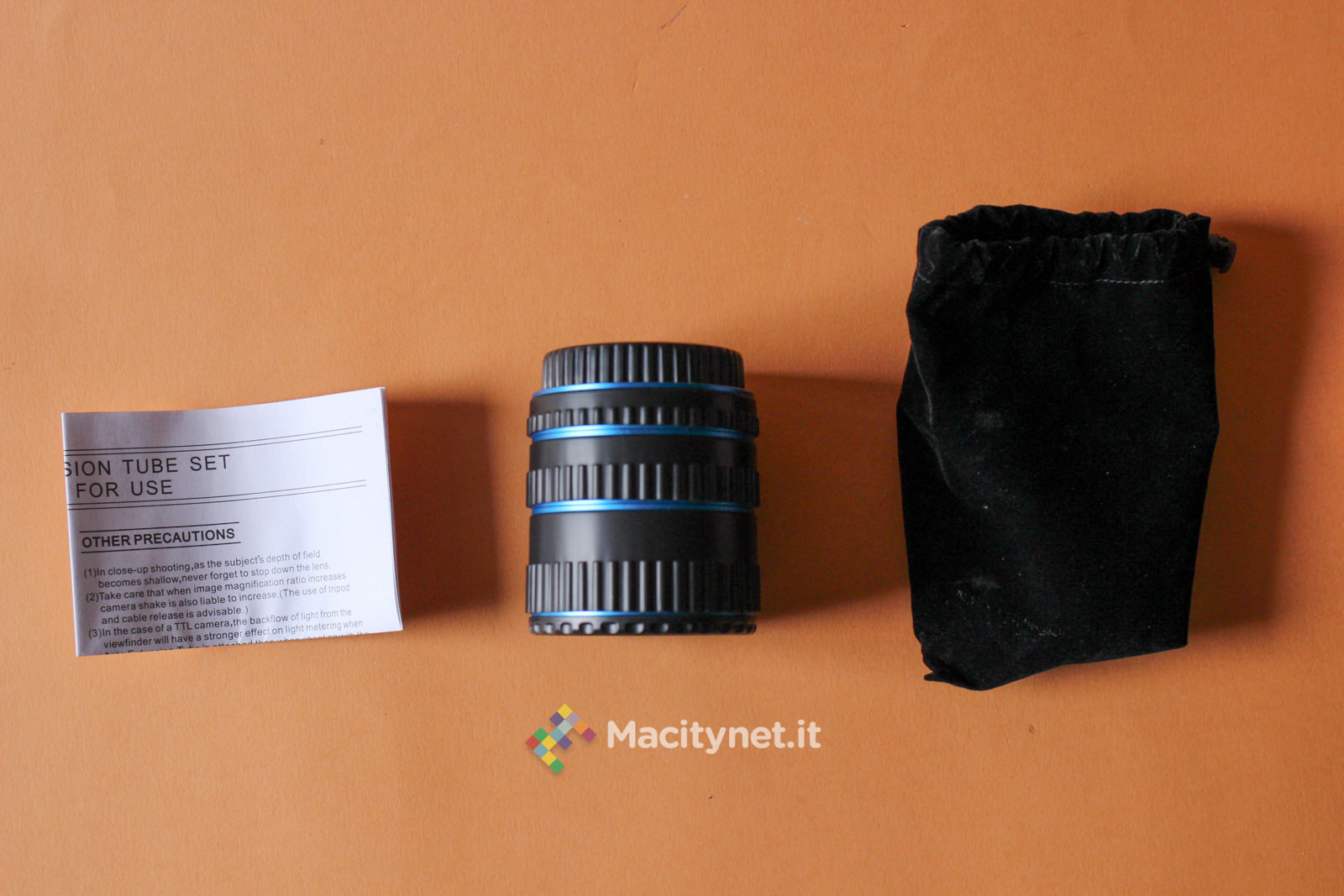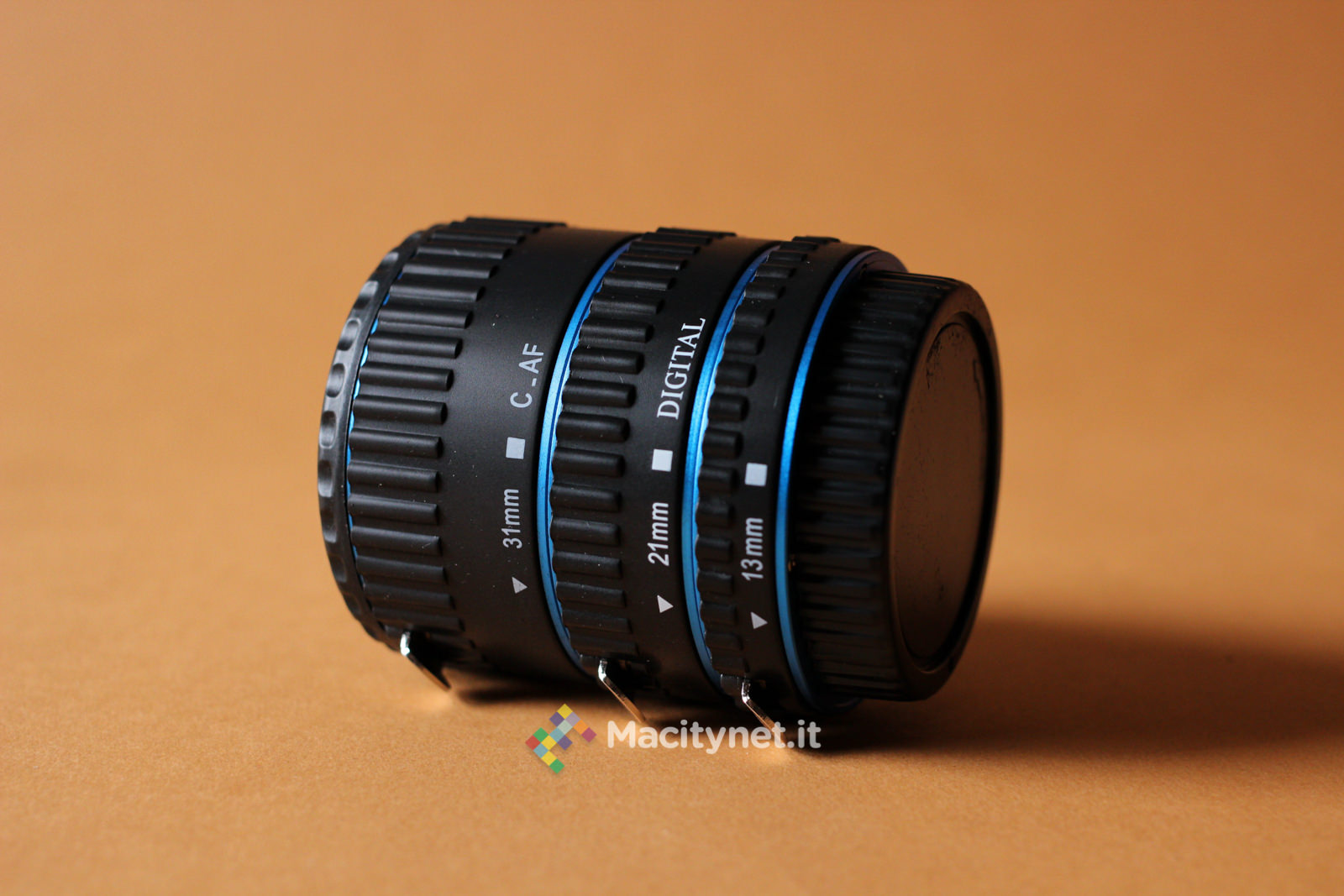 Il set di tubi (13 + 21 + 31 mm) di prolunga Andoer, specifici per Canon, sono in vendita su Amazon a 42 euro e la spedizione è compresa nel prezzo in tre varianti di colore dell’alluminio: blu, come quella dei nostri test, rossa e argento.