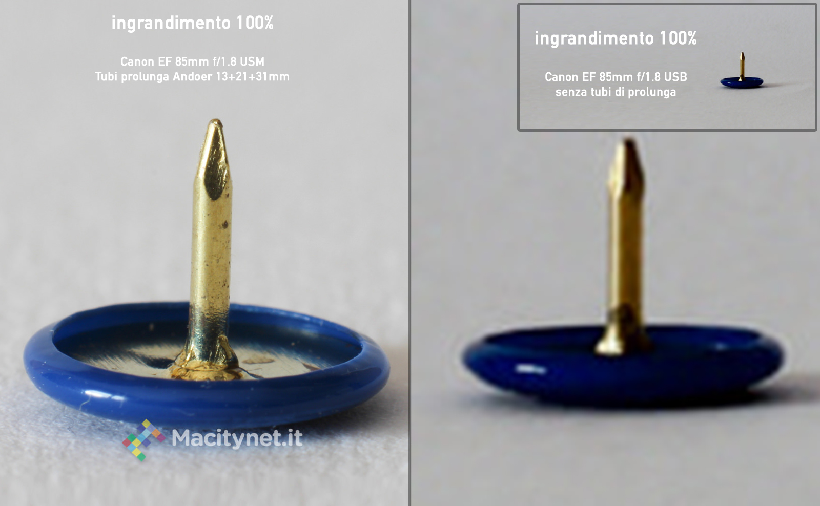 Abbiamo anche provato a giocare con le varie combinazioni di tubi in casa, per scoprire il livello effettivo di zoom fotografando lo stesso soggetto, nel nostro caso una puntina da disegno. Il livello di dettaglio ed ingrandimento della puntina con tutti e tre i tubi è davvero elevato: impressionante il confronto con la foto fatta – con lo stesso obiettivo – senza alcun tubo di prolunga, dimostrando l’effettiva utilità dei tubi per questo genere fotografico.