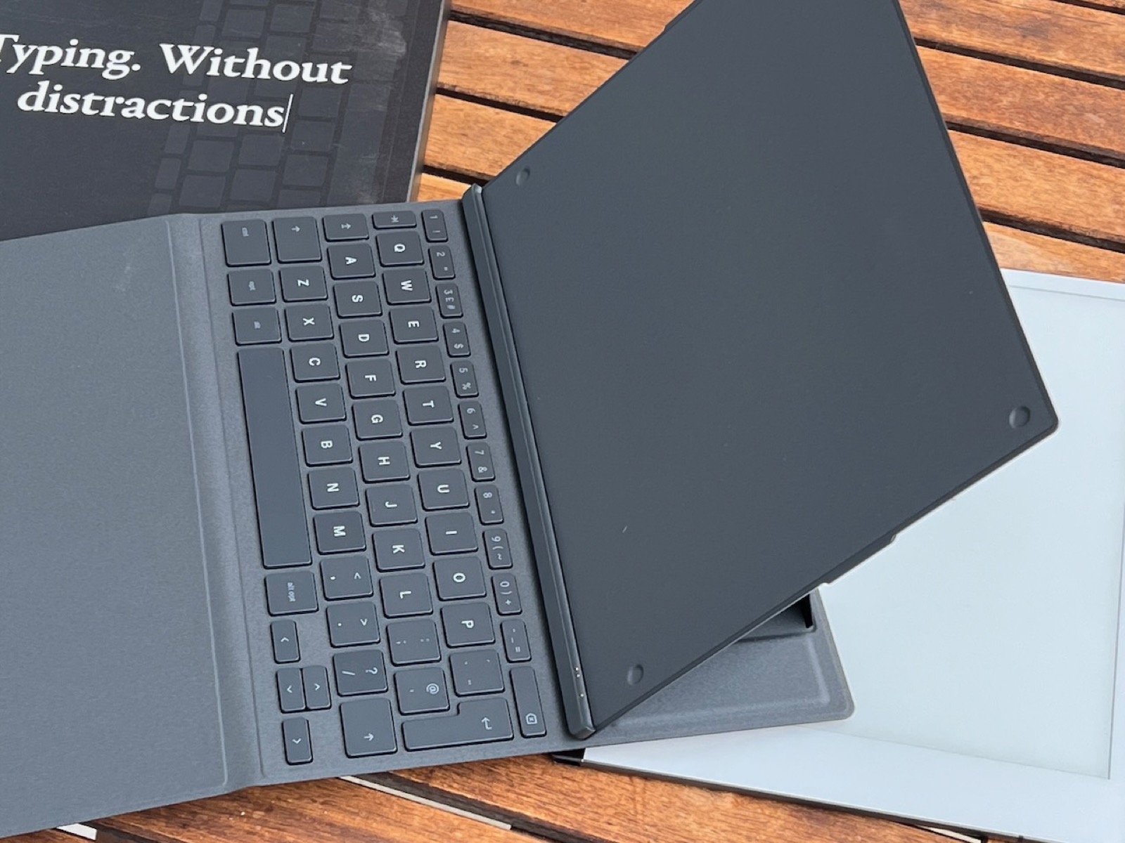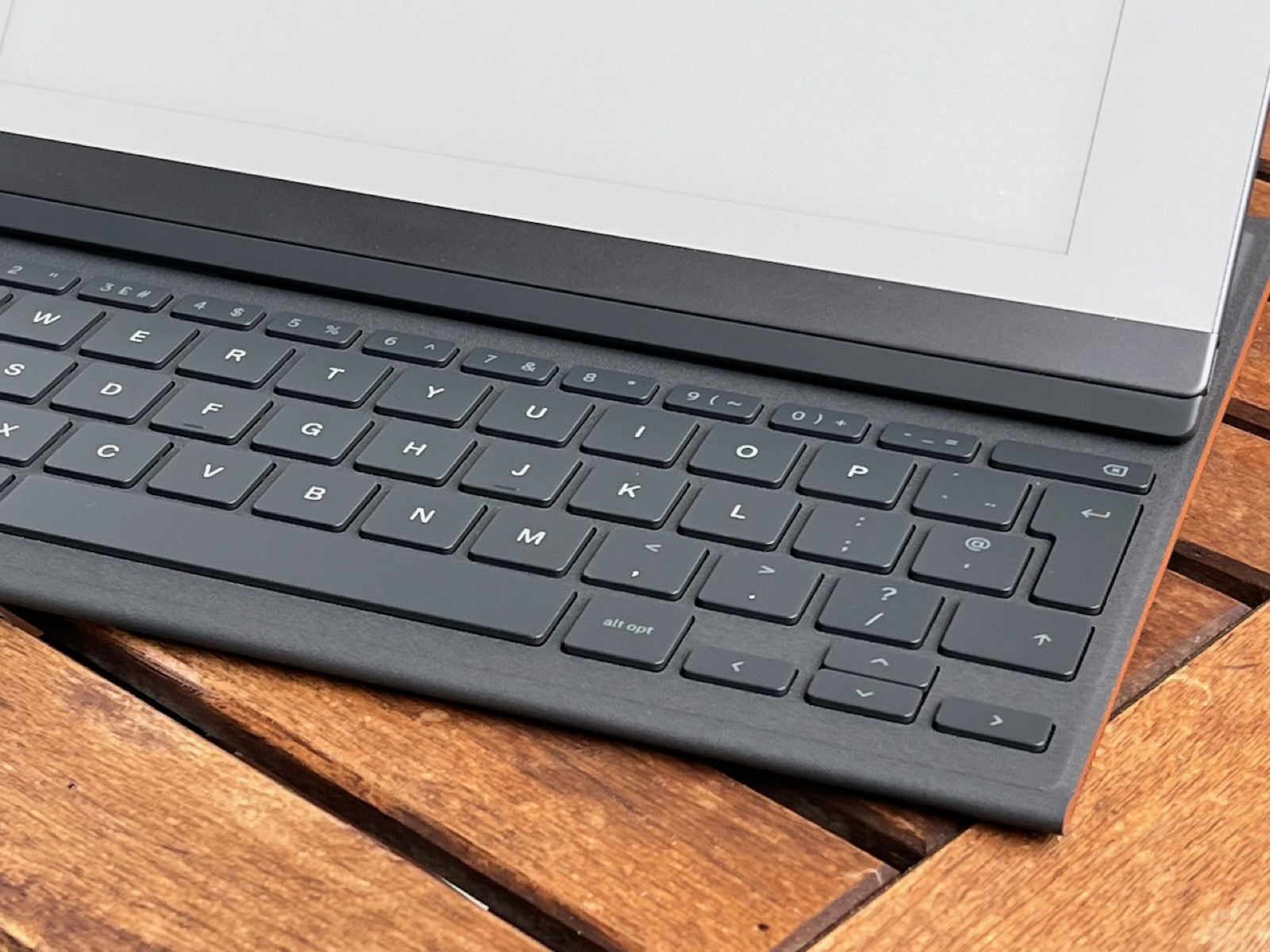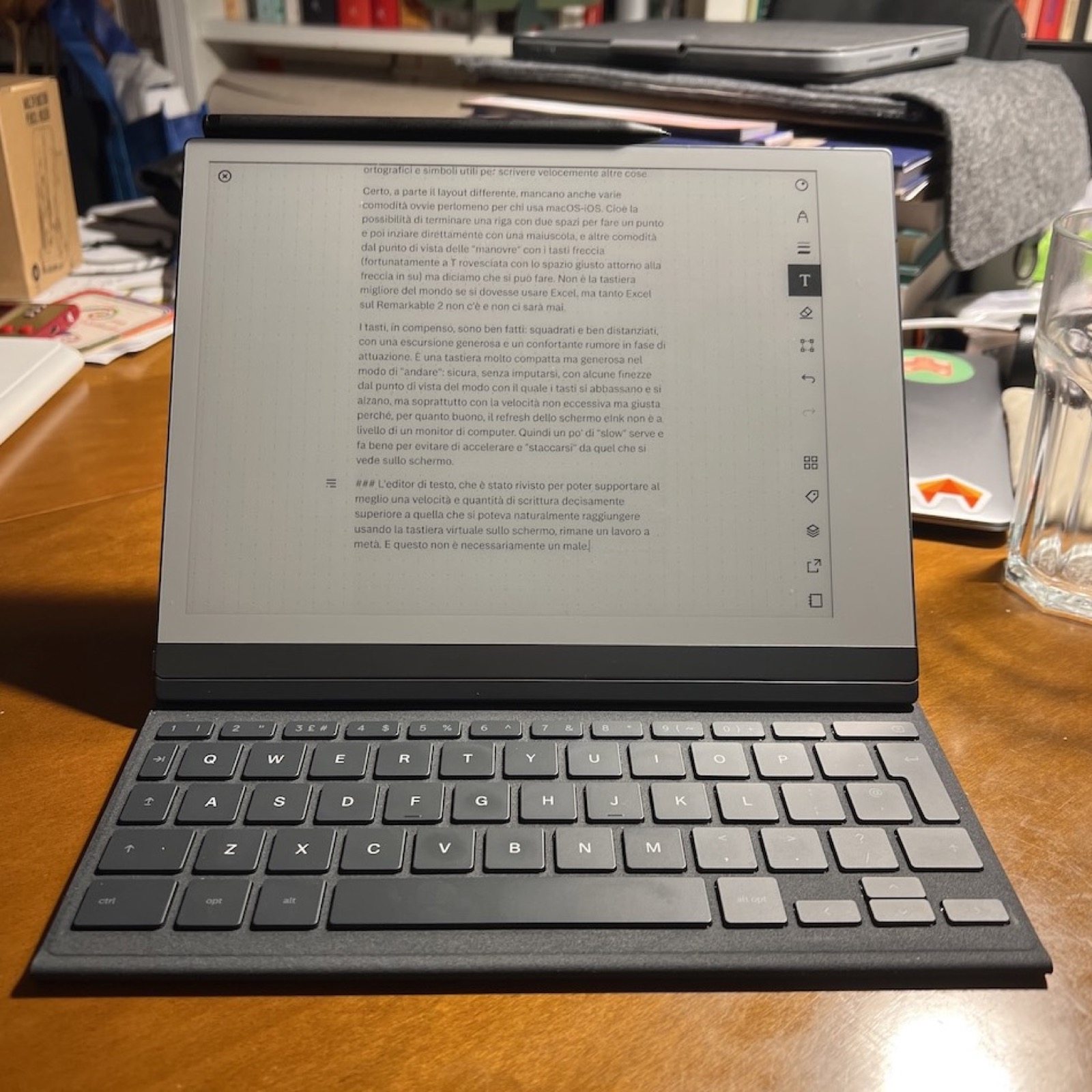 I tasti, in compenso, sono ben fatti: squadrati e ben distanziati, con una escursione generosa e un confortante rumore in fase di attuazione che non è eccessivo. È una tastiera a membrana con tasti a farfalla, ma l’attuazione è precisa e puntuale. È una tastiera molto compatta ma generosa nel modo di “andare”: sicura, senza affondare e senza imputarsi, con alcune finezze dal punto di vista del modo con il quale i tasti si abbassano e si alzano, ma soprattutto con la velocità non eccessiva ma giusta perché, per quanto buono, il refresh dello schermo eInk non è a livello di un monitor di computer. Quindi un po’ di “slow” serve e fa bene per evitare di accelerare e “staccarsi” da quel che si vede sullo schermo.