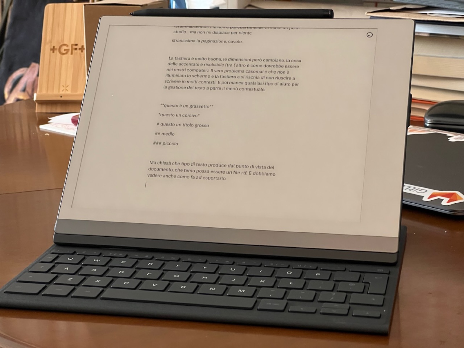 Ah, avrete notato che, nonostante la mania che abbiamo per le tastiere italiane e per il markdown, non stiamo sparando contro questo dispositivo nonostante il layout italiano non sia disponibile almeno per adesso e il markdown sia un problema anche perché il file di testo che viene esportato dall’apparecchio è sostanzialmente un RTF che va nel corpo della mail oppure un pdf o un’immagine nel caso ci siano anche dei disegni o scritte a mano.