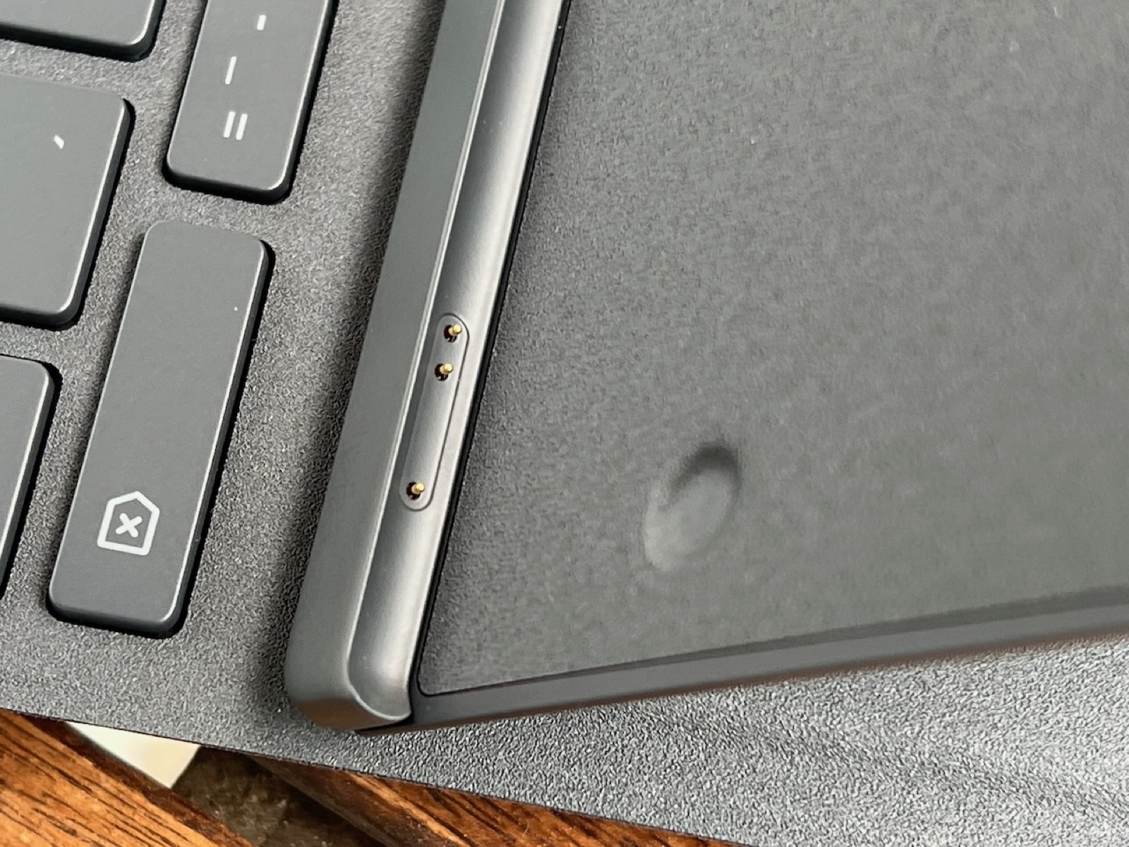 La tastiera del reMarkable 2 è ovviamente costosa e non è retroilluminata. Si aggancia magneticamente al tablet eInk e viene attivata e alimentata direttamente dal dispositivo grazie a tre (dei quattro) pin presenti sul lato del tablet, che così si capisce a cosa potevano servire. I tre pin bastano per portare sia la corrente che fa in modo che la depressione dei tasti sia una forma di attuazione elettrica, che i bit necessari per registrare la scrittura una determinata lettera.