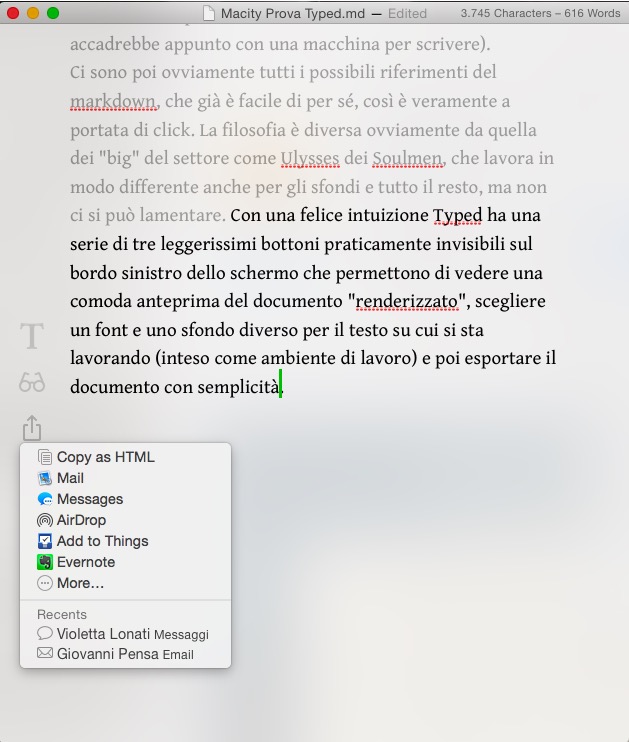 Ci sono poi ovviamente tutti i possibili riferimenti del Markdown, che già è facile di per sé, così è veramente a portata di click. La filosofia è diversa ovviamente da quella dei “big” del settore come Ulysses dei Soulmen, che lavora in modo differente anche per gli sfondi e tutto il resto, ma non ci si può lamentare. Con una felice intuizione Typed ha una serie di tre leggerissimi bottoni praticamente invisibili sul bordo sinistro dello schermo che permettono di vedere una comoda anteprima del documento “renderizzato”, scegliere un font e uno sfondo diverso per il testo su cui si sta lavorando (inteso come ambiente di lavoro) e poi esportare il documento con semplicità.