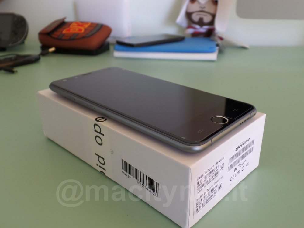 Che le forme e alcune caratteristiche di questo uleFone Be Touch si ispirino ad iPhone e ad Apple non è un mistero. E’ sufficiente, infatti, dare uno sguardo alla confezione di vendita per rendersene immediatamente conto. Tutta bianca, mentre nella parte superiore spicca soltanto la sagoma del dispositivo e un piccolo pallino argentato che serve proprio a sottolineare una delle caratteristiche principali del terminale: il sensore di impronte digitali. Il box, al suo interno, è molto semplice e oltre al terminale Android, con una pellicola già applicata, presenta anche una seconda pellicola di ricambio, un brevissimo manuale, cavo di ricarica, presa da muro e auricolari standard di colore bianco. Importante notare, che al suo arrivo, la batteria del terminale è già inserita, ma i contatti sono sigillati e protetti, e dovrà essere liberata dal nastro isolante, prima di poter accedere il dispositivo.