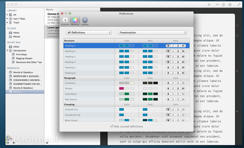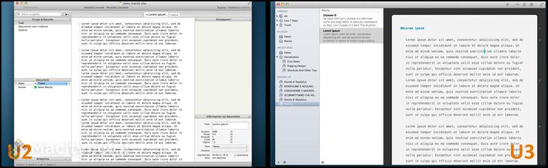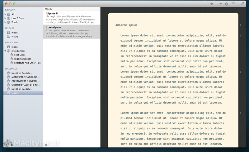 E proprio per chi ama sintassi di formattazione come Markdown e Textile che è stato pensato l’editor vero e proprio. La terza colonna, la più grande, è infatti tutta dedicata alla scrittura del testo, ma stavolta è ripulita da qualsiasi elemento di distrazione. L’unica eredità da Ulysses 2 è la numeratura dei paragrafi, posizionata stavolta in maniera più discreta accanto alla barra di scorrimento. Chi è abituato a utilizzare editor tradizionali noterà subito la completa assenza di strumenti e pulsanti per la formattazione: il testo può essere tranquillamente sistemato poco prima dell’esportazione oppure, per i più avezzi al Markdown, mentre si scrive, utilizzando un comodo sistema di asterischi e cancelletti. Ulysses III utilizza infatti un sistema chiamato “Plain Text Enhanced”, ma per chi non è pratico di scrittura in formato plain-text è possibile far comparire un’ulteriore colonna contenente una completa legenda. In fase di esportazione, è possibile poi scegliere tra i formati PDF, RTF, TXT, Word, HTML e Markdown. Originale e apprezzata è la possibilità di scegliere un software esterno con cui aprire al volo il file, ma nel complesso Scrivener mette a disposizione qualche strumento in più per personalizzare il risultato finale, e allo stato attuale manca il supporto al formato ePub, presente in Ulysses 2 e che sarà aggiunto nella nuova versione soltanto successivamente.