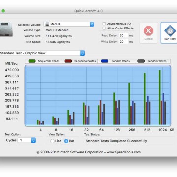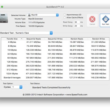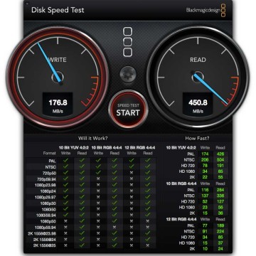 Per le consuete prove di rito abbiamo sfruttato un Mac Mini fine 2012, sostituendo il disco rigido tradizionale con l’SSD di Sandisk. Il miglioramento in termini di velocità di avvio ed esecuzione dei programmi, è evidente sin dall’avvio, anche senza fare test specifici. Ad ogni modo abbiamo eseguito le operazioni di rito con le utility dedicate, ottenendo risultati a conferma di quanto già evidenziavano prove empiriche quali la copia dei file o l’avvio dei programmi. L’utility Disk Speed Test di Black Magic Design ha evidenziato valori medi di 176.8 MB/s in scrittura e 450.8 MB/s in scrittura. Valori simili quelli registrati con QuickBench e Aja System test (fate riferimento ai grafici che alleghiamo in questo articolo).
