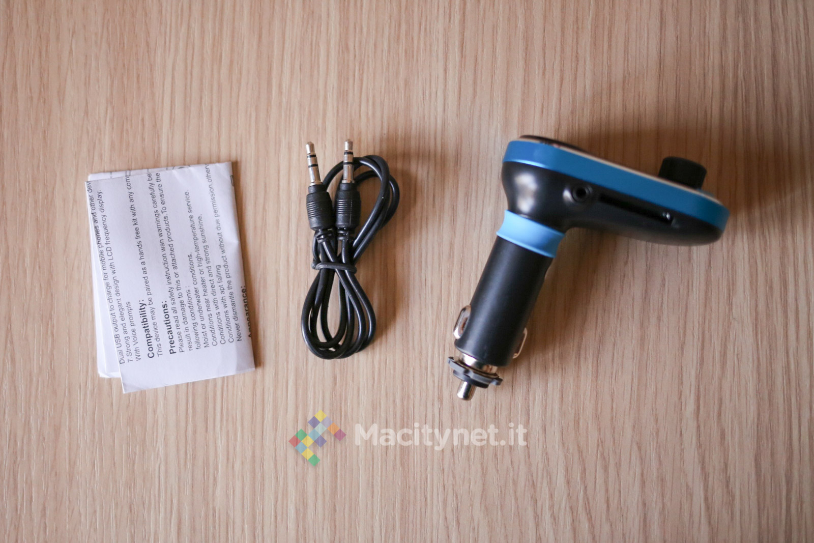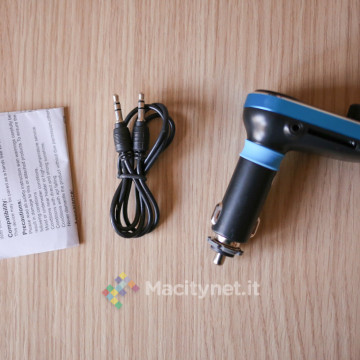 È accompagnato da un cavo jack-jack da 3,5 millimetri ed un conciso manuale delle istruzioni. Molto piccolo e leggero (la bilancia da cucina ci dice che supera appena i 40 grammi), sembra di avere tra le mani un evoluto caricabatteri da auto con presa accendisigari.
