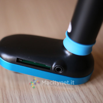A dare quest’impressione è la protuberanza, che gli conferisce una forma ad “L”, dove troviamo un display LCD opportunamente nascosto da una scocca in plastica nera quando spento, una manopola per la regolazione delle funzioni, i tasti M, FWD e BWD, il foro per il microfono e due ingressi USB. Di questi ultimi, quello più esterno ricarica un qualsiasi dispositivo fino a 2.1 A confermati dal nostro amperometro digitale, ciò significa che può dare energia senza sforzi anche ad un tablet; l’altra, può ospitare una chiavetta USB e leggerne la musica mentre, sebbene il manuale d’uso affermi il contrario, non è pensata per ricaricare i dispositivi (i nostri test dimostrano che eroga intorno ai 0,45 A).