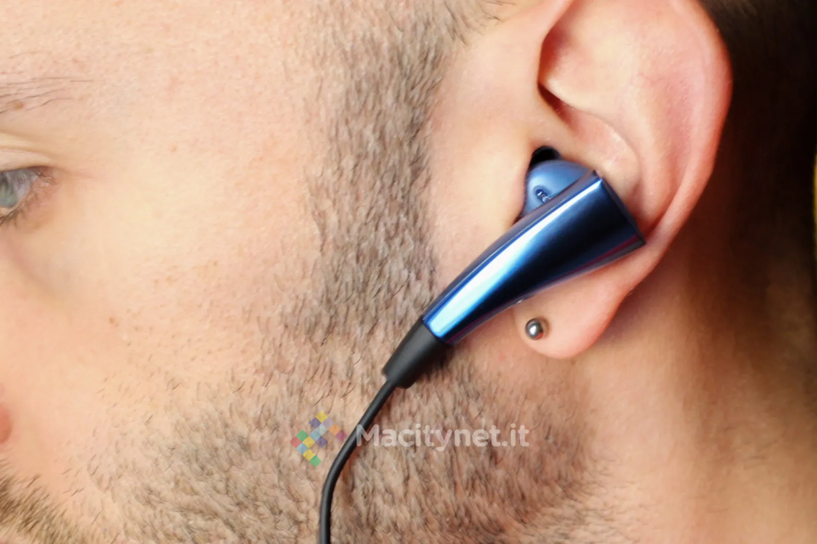 Gli auricolari hanno una forma insolita ma risultano comunque comodi e ben stabili all’interno delle orecchie. Nel caso dovessero andare troppo strette, è sufficiente sostituire i gommini con gli altri forniti in dotazione, dotati di una testa leggermente più piccola, probabilmente una taglia S (manca, peccato, una taglia XL).