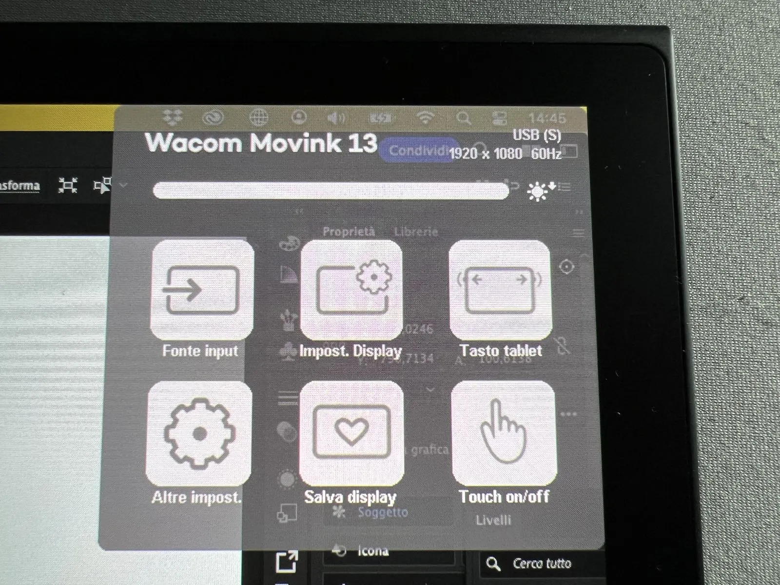 La doppia posizione dei pulsanti e connettori (a destra e sinistra) permette alla Wacom Movink 13 collegamenti agevoli e il menu in sovrimpressione, che appare grazie al pulsante, permette di cambiare alcuni setup al volo, tra i quali abbiamo apprezzato soprattutto quello relativo all’attivazione e disattivazione del touch.