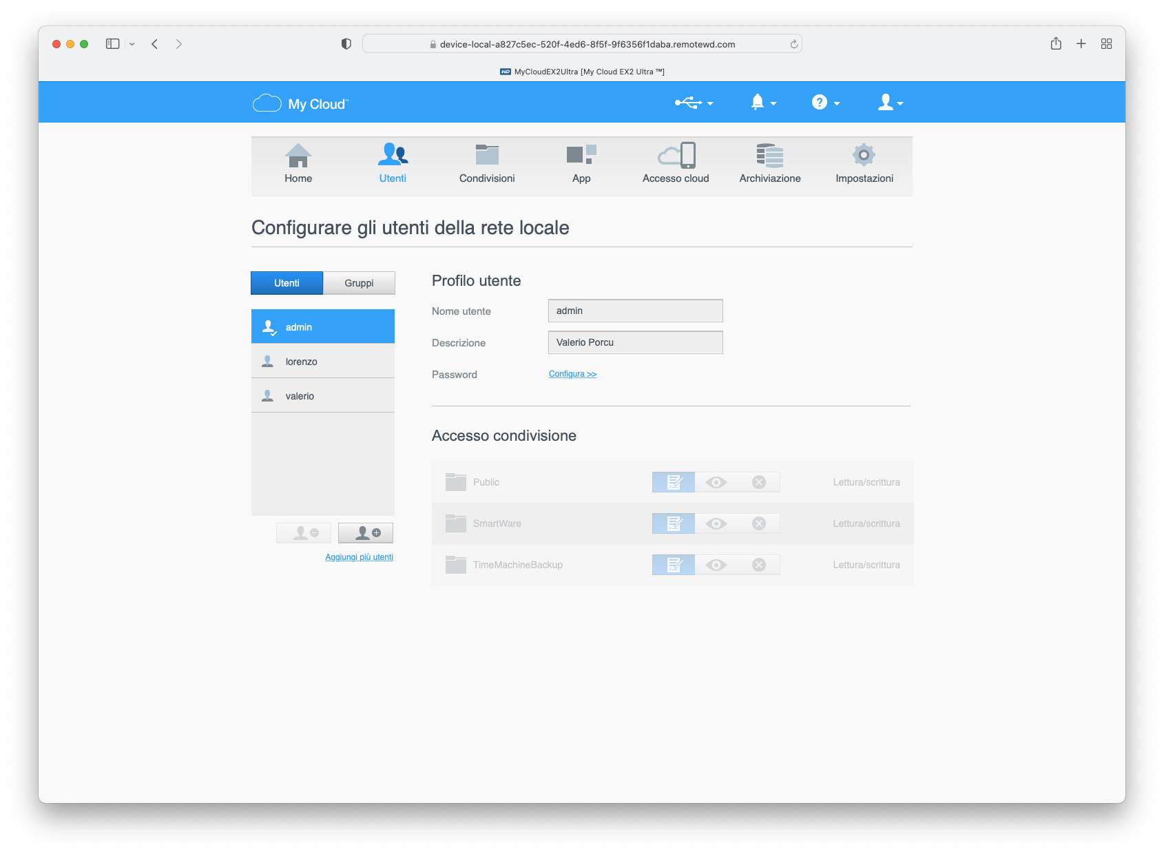 Questa interfaccia, che si ottiene accedendo in locale al WD My Cloud EX2 Ultra via browser, serve per gestire tutti i parametri, come la formattazione dei dischi, il RAID, le cartelle condivise, gli utenti e tutti i servizi (a proposito, niente AFP, da Mac si accede via SMB o FTP, segno dei tempi).