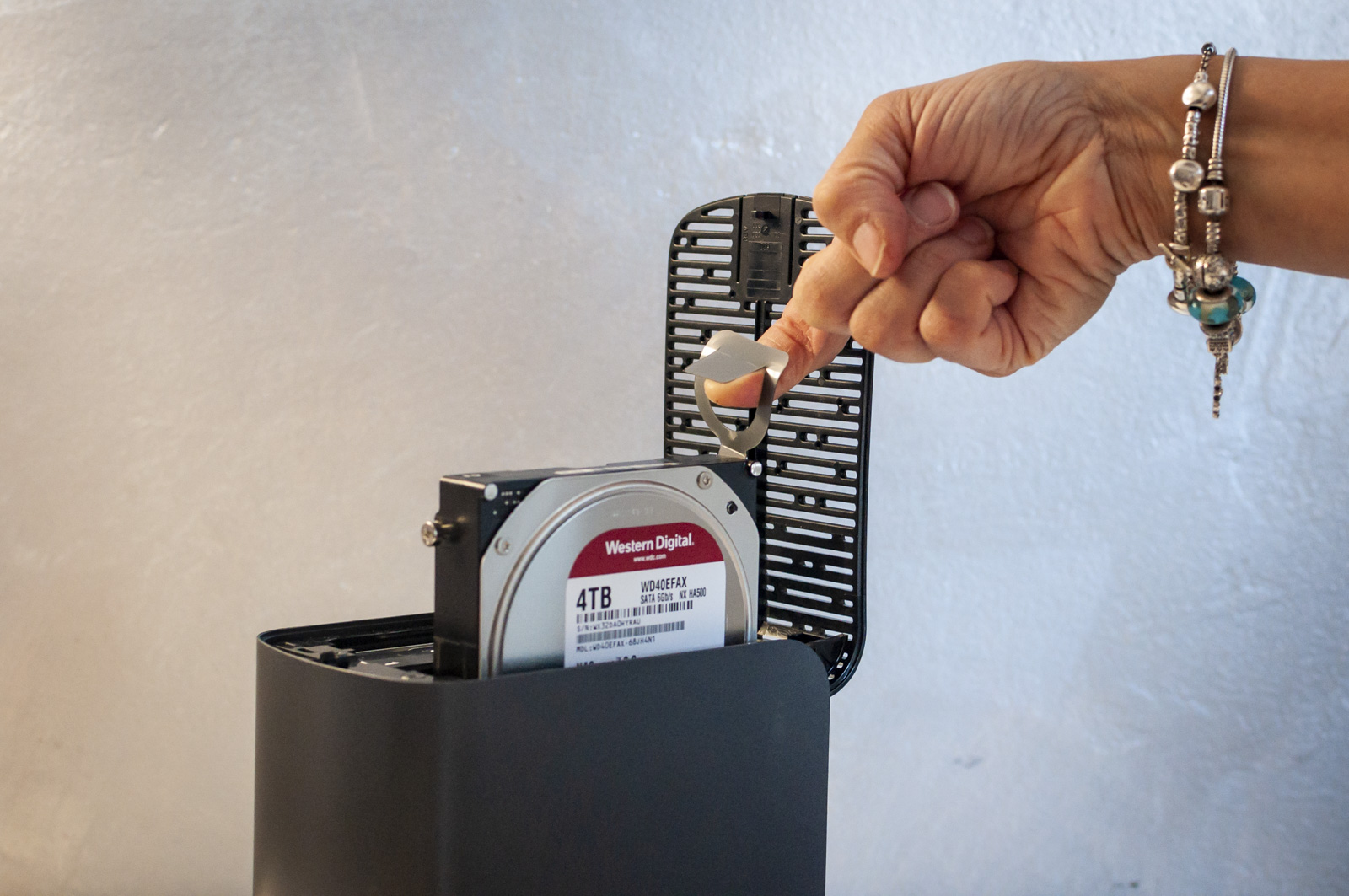 Le dimensioni sono di 154,94 x 99,06 x 171,45 mm, sufficienti a contenere due dischi meccanici WD RED da 3,5″, facilmente sostituibili anche dall’utente finale in qualunque momento, grazie ad un sistema facilitato per l’estrazione, nella parte superiore.