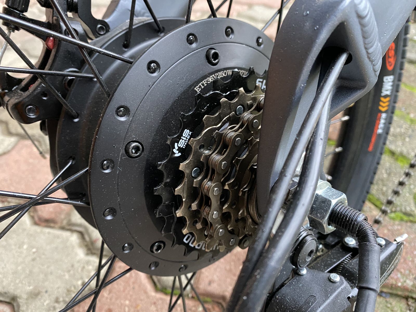 Il primo sguardo per chi, come chi scrive, usa con frequenza una bicicletta per sport, è sul cambio. Non abbiamo visto molte biciclette elettriche contare su un cambio Shimano a sei velocità. Ok non è un Dura-Ace né un Ultegra, quanto un Tourney RD-TY21-B-GS, ma nonostante sia un low cost per bici da strada, siamo comunque di fronte ad un prodotto creato dalla principale azienda al mondo nel settore della componentistica per biciclette. Non ci sono molte concorrenti, tanto meno cinesi, che scelgono componenti come queste.