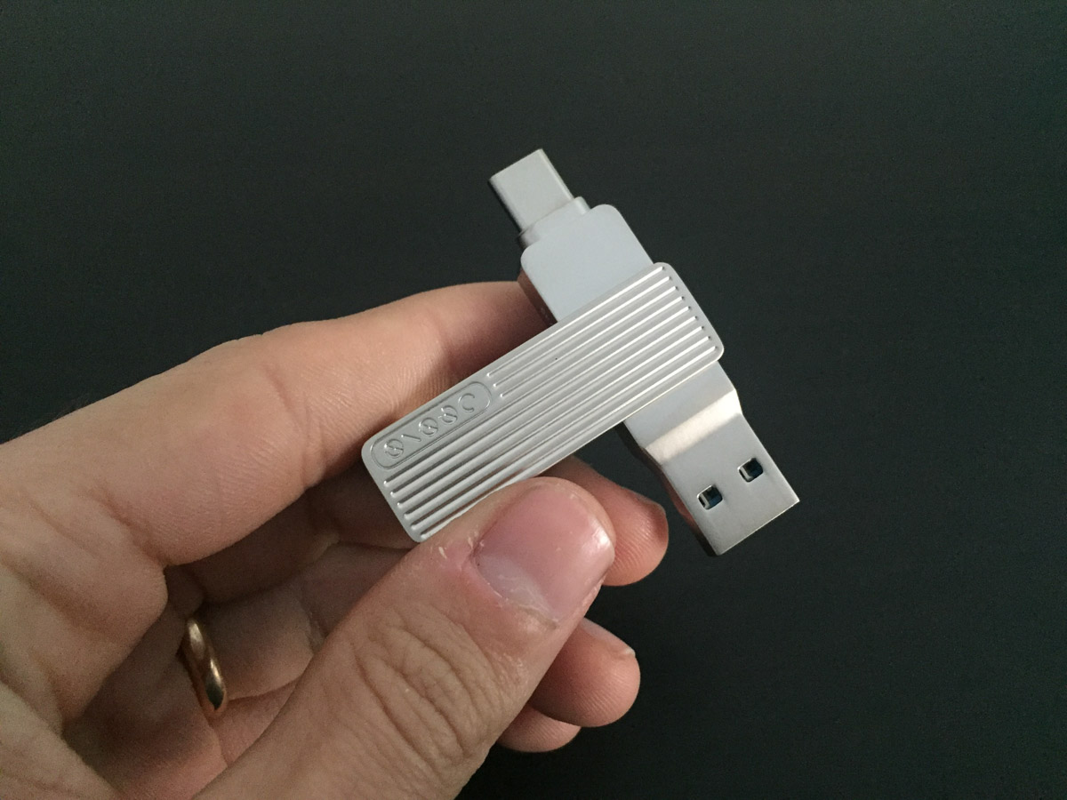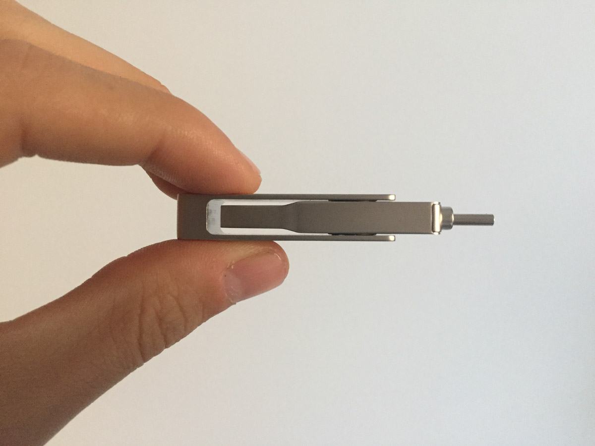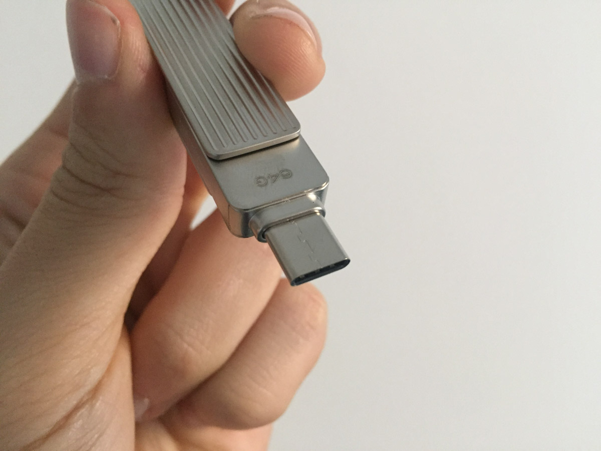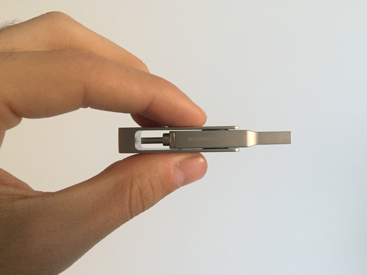 La posizione della placca non pregiudica il funzionamento della chiavetta: paradossalmente si può utilizzare la chiavetta anche posizionando la placca esterna “a T”, in quanto è sufficiente che ci sia abbastanza spazio per poter collegare una delle due spine ad un dispositivo, ma poter nascondere un connettore permette di ridurre le dimensioni della chiavetta, che così può ad esempio essere collegata alla spina USB-C di un MacBook mantenendo libero accesso ad una seconda presa adiacente.