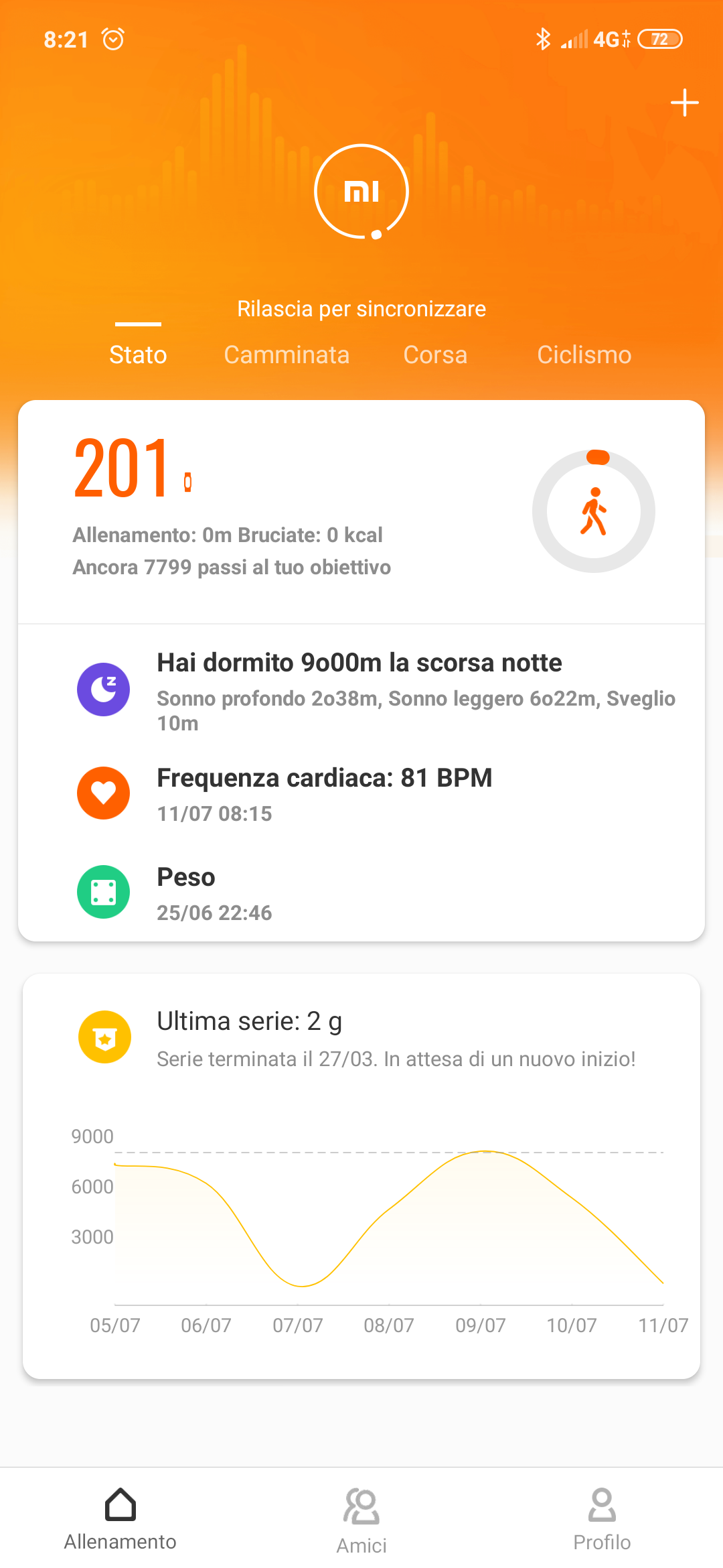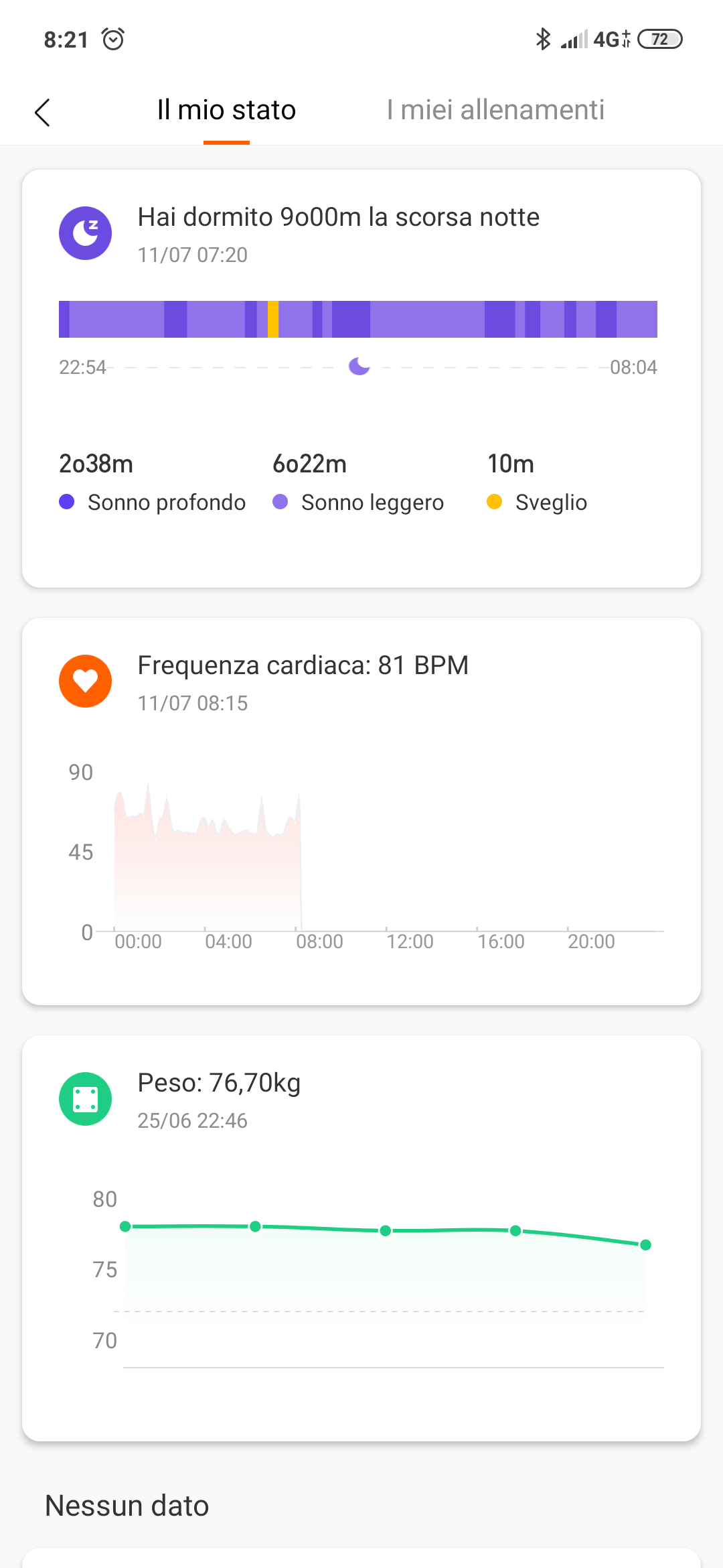 Mostra immediatamente i passi fatti, e le informazioni sul sonno, sull’ultima frequenza cardiaca rilevata e sul peso, che può impostare manualmente l’utente, oppure ottenere automaticamente dalla bilancia Mi Scale.