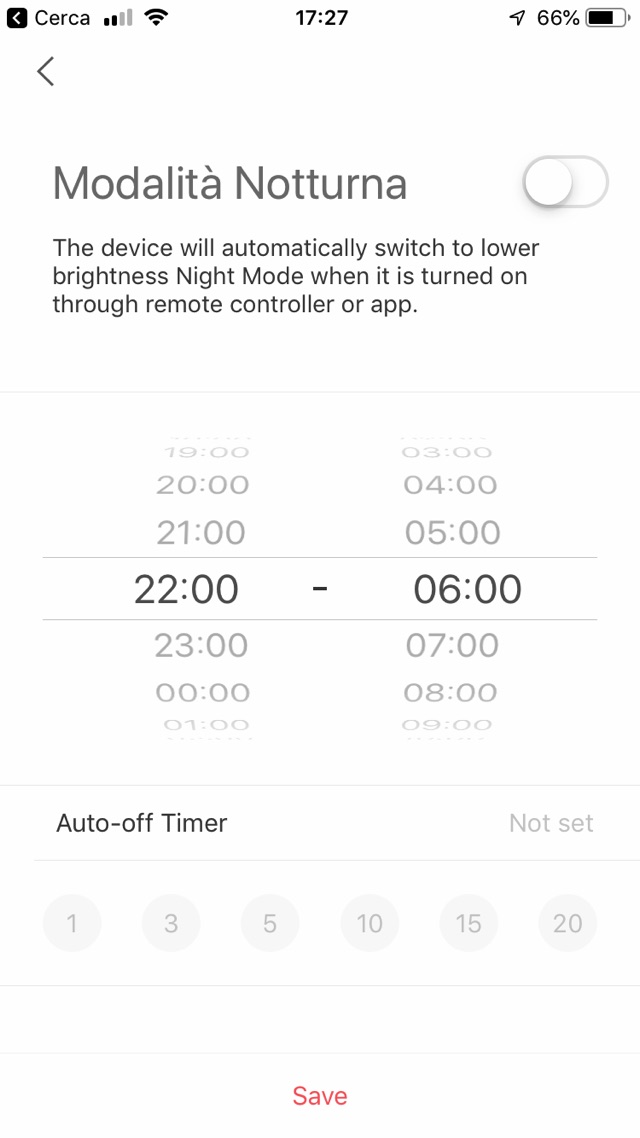 Se tenete premuto per due secondi il pulsate on/off a lampada accesa partirà un timer di spegnimento pre-regolato a 15 minuti ma potete sempre gestire la temporizzazione dalla app di controllo. La lampada come le altre di Yeelight ha una modalità notturna che funziona con soli 2 Lumen e permette di fornire una illuminazione di sicurezza.
