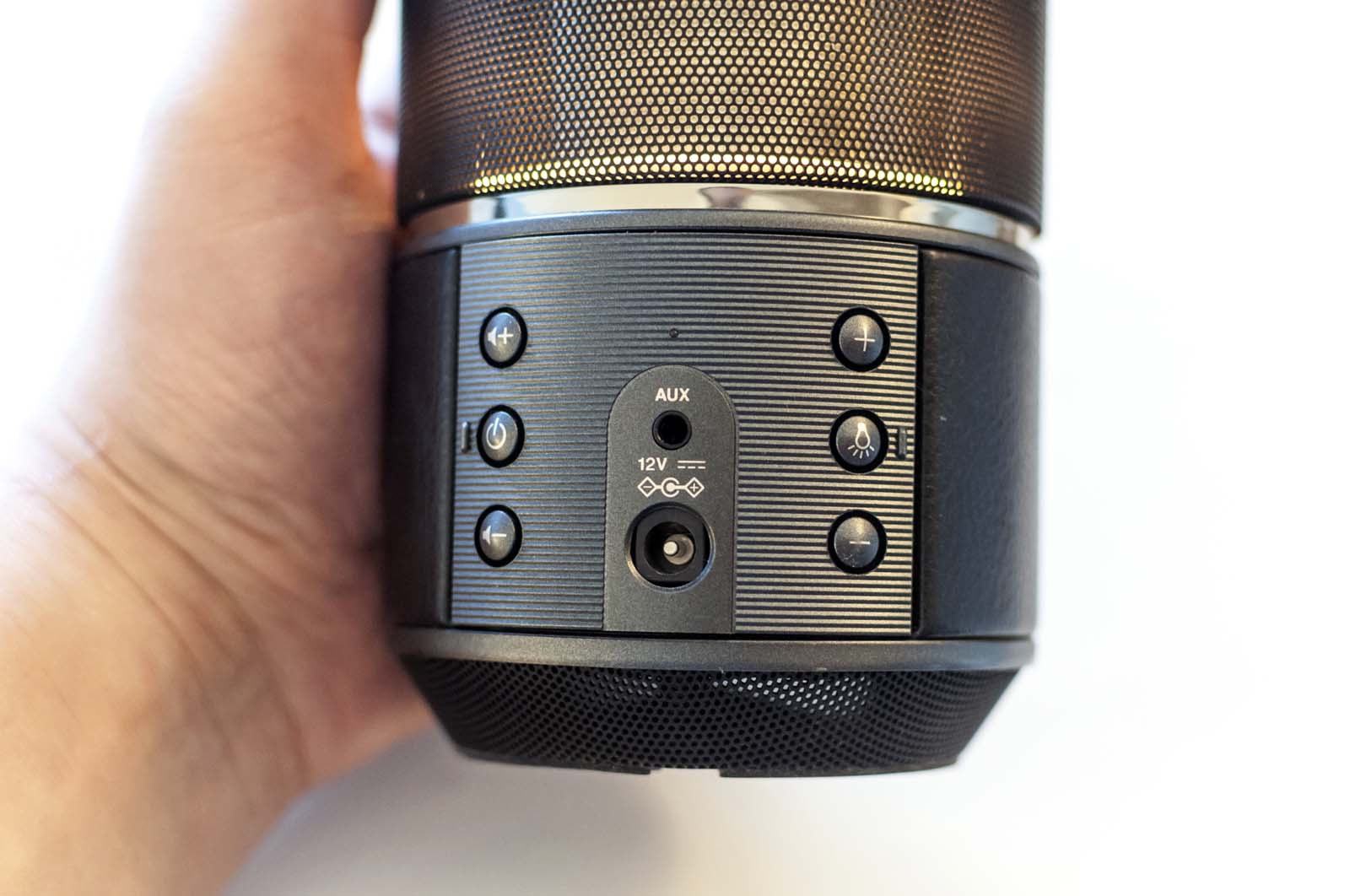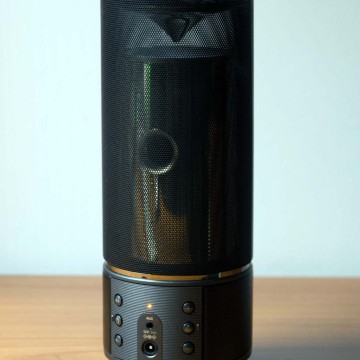 Fuori dalla scatola l’LSX-70 è un grosso cilindro diviso in due parti: in alto trovano posto i diffusori, mentre più in basso i comandi sono cinturati da una fascia in pelle sintetica che impreziosisce un prodotto senza dubbio destinato ad un pubblico esigente in quanto a materiali utilizzati. Le nostre prove sono state effettuate sul modello in metallo Nero, identico agli altri eccezion fatta per la livrea più scura: la fascia che comprende i sei pulsanti di controllo accompagna il connettore dell’alimentazione e il jack da 2.5” per l’audio analogico e una piccola spia di colore giallo per l’attività.