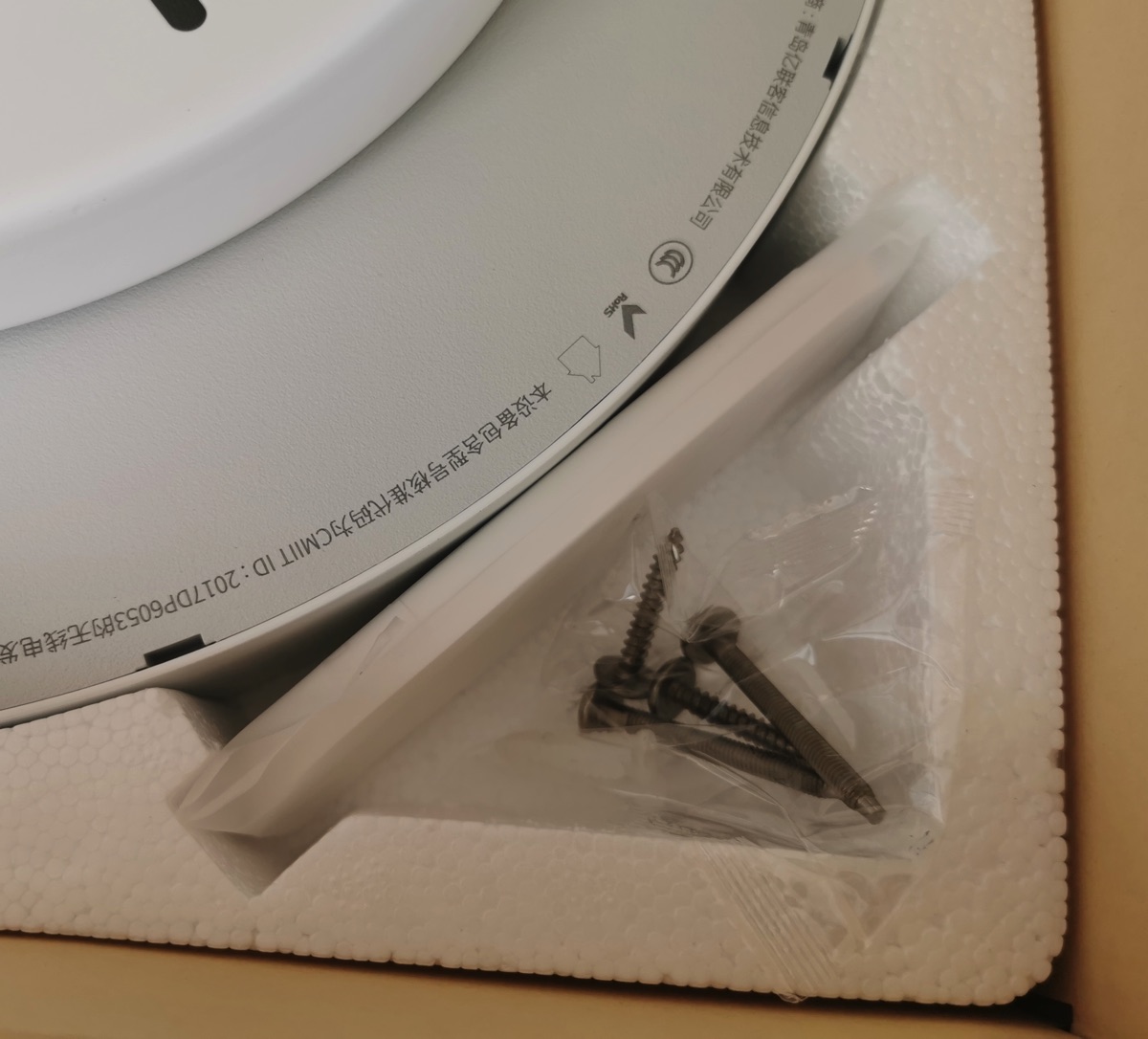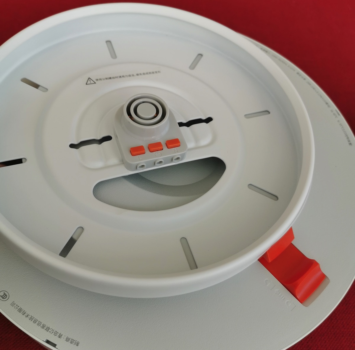 All’interno troviamo la plafoniera vera e propria divisa in due parti con l’aggancio classico Yeelight e i pulsatoni rossi a molla che permette il montaggio, un telecomando, comune a tutte le plafoniere con comunicazione Bluetooth e i tappi per un muro tradizionale che permettono il montaggio a soffitto.