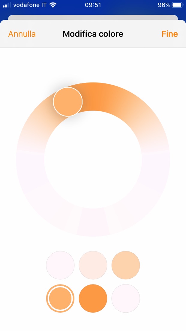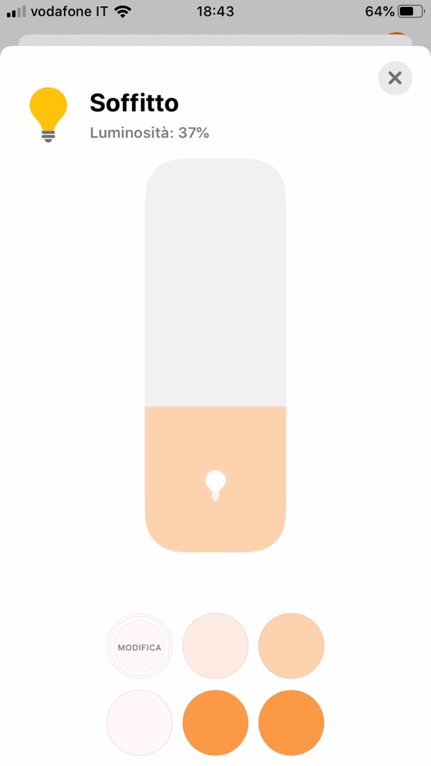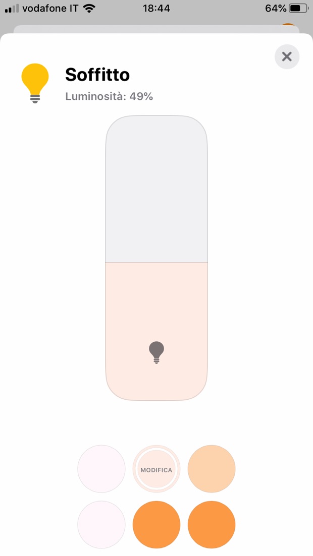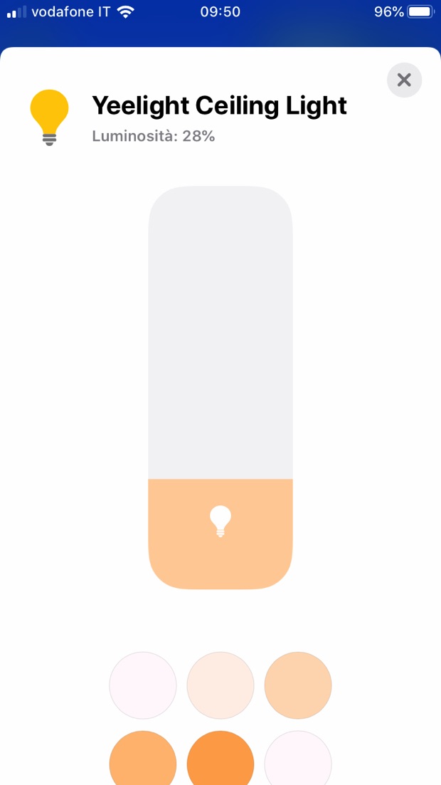 Nelle immagini qui sotto potete vedere tutte le opzioni di attivazione e di gestione di Yeelight YLXD41Y con Homekit: a disposizione avete sia il livello di illuminazione che la temperatura colore da 2700K a 6500K : quest’ultima si seleziona rapidamente con i bottoni a dispozione in 6 livelli.