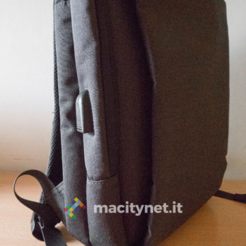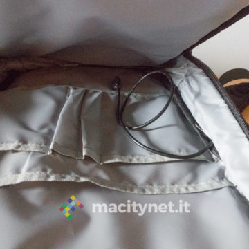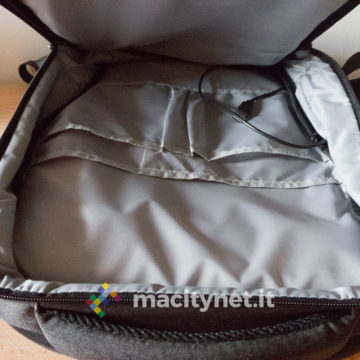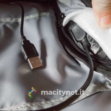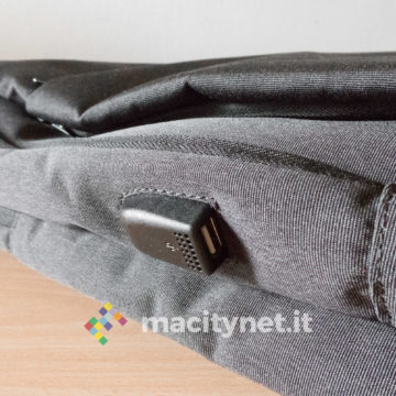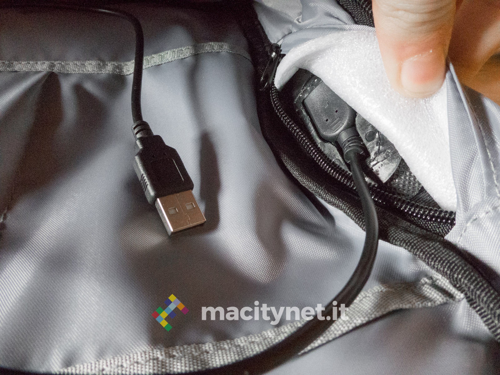 Una delle funzioni più apprezzate e che effettivamente contraddistinguono questo zaino consiste nella presa USB esterna. Sul lato sinistro praticamente spunta un cilindro in plastica alla cui base è incassata una porta USB-A (la scelta di rivolgerla verso il basso la protegge da acqua e polvere). Questa presa è collegata ad un cavo lungo circa 30 centimetri che spunta sul bordo laterale della tasca principale: all’estremità troviamo una spina USB-A che può (anzi, dovrebbe) essere collegata ad una power bank, in modo tale da sfruttare l’energia accumulata dalla batteria per ricaricare i dispositivi in mobilità senza doverla estrarre dallo zaino.