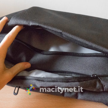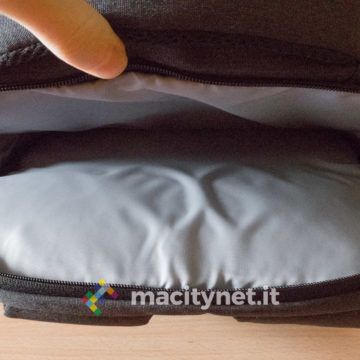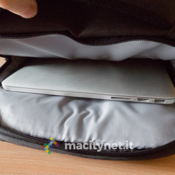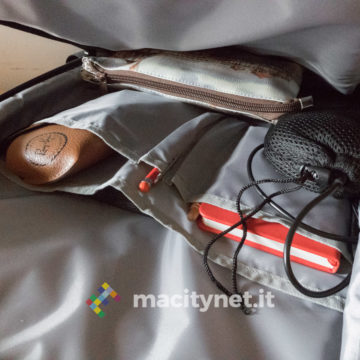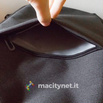 Nonostante risulti esteticamente molto sottile, c’è spazio per metterci davvero di tutto. Oltre ad essere ben distribuito, ci sono tasche di tutte le misure e messe ai punti giusti. Nello specifico abbiamo due tasche principali: la più vicina al dorso può contenere un computer portatile. Il produttore dice massimo 15.6 pollici ma noi crediamo che ci sia spazio anche per uno con schermo leggermente più grande, visto che il nostro MacBook Pro 15’’ entra benissimo e avanza molto spazio sia sopra che ai lati.