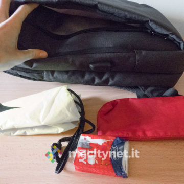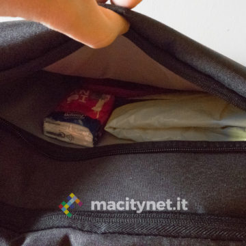 L’altra tasca, che potremmo definire La tasca principale, si trova invece dalla parte opposta della maniglia ed al suo interno ha spazio per tantissimi altri oggetti. Su uno dei due lati ci sono infatti altre tre tasche che permettono di distribuire meglio il contenuto. Ad esempio, spesso utilizziamo una di queste tasche per tenere a portata di mano una Moleskine, nell’altra invece infiliamo una fotocamera compatta (in foto abbiamo messo il portafogli perché stavamo usando la fotocamera per scattare le fotografie). Quella più grande si può usare per tenere un tablet, oppure un paio di occhiali da sole o qualsiasi altra cosa. C’è molto spazio anche per altri oggetti, oppure per una felpa o una bottiglia d’acqua da mezzo litro.