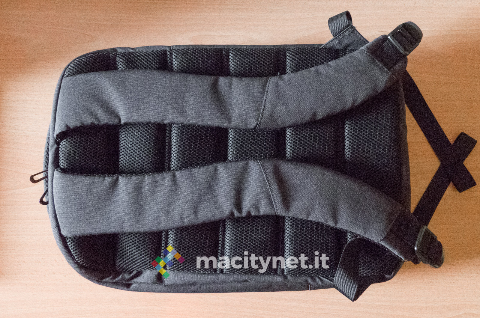 Abbiamo sostituito con soddisfazione il vecchio zaino con questo di Omorc per un’intera settimana nel tragitto casa-lavoro, oltre che per qualche sporadica uscita serale durante la quale avevamo bisogno di avere con noi il computer. A suo favore segnaliamo la presenza di un morbidissimo schienale, imbottito al punto giusto e con una copertura traforata che in estate dovrebbe garantire una buona traspirazione. Se il periodo dell’anno non ci ha permesso di valutare questa caratteristica, possiamo però dire che il confort è assicurato: anche con il MacBook sulla schiena lo zaino non risulta troppo rigido proprio perché ad affiancarlo c’è uno schienale molto morbido e con una buona imbottitura, che ritroviamo seppur in maniera meno consistente sugli spallacci.