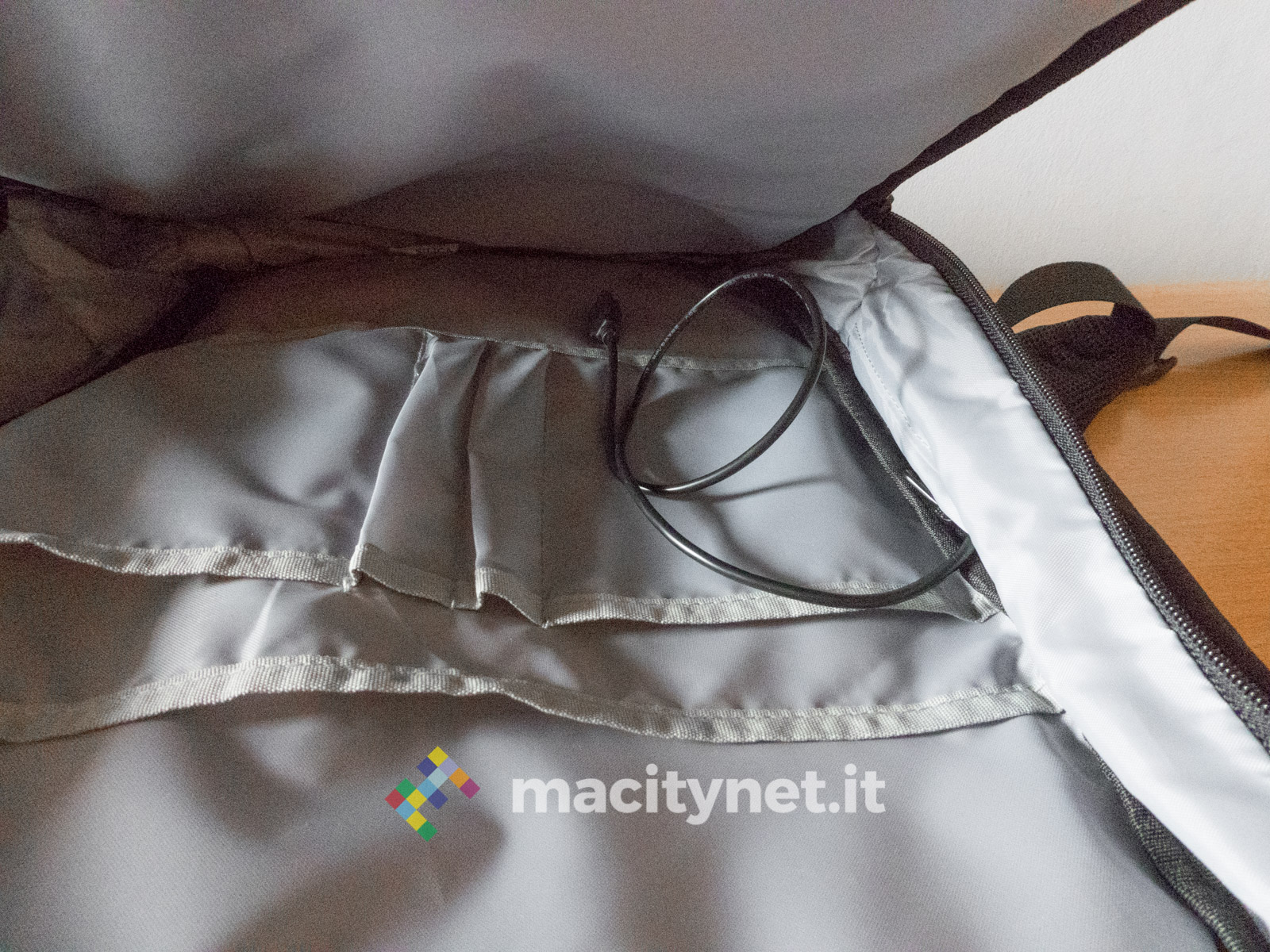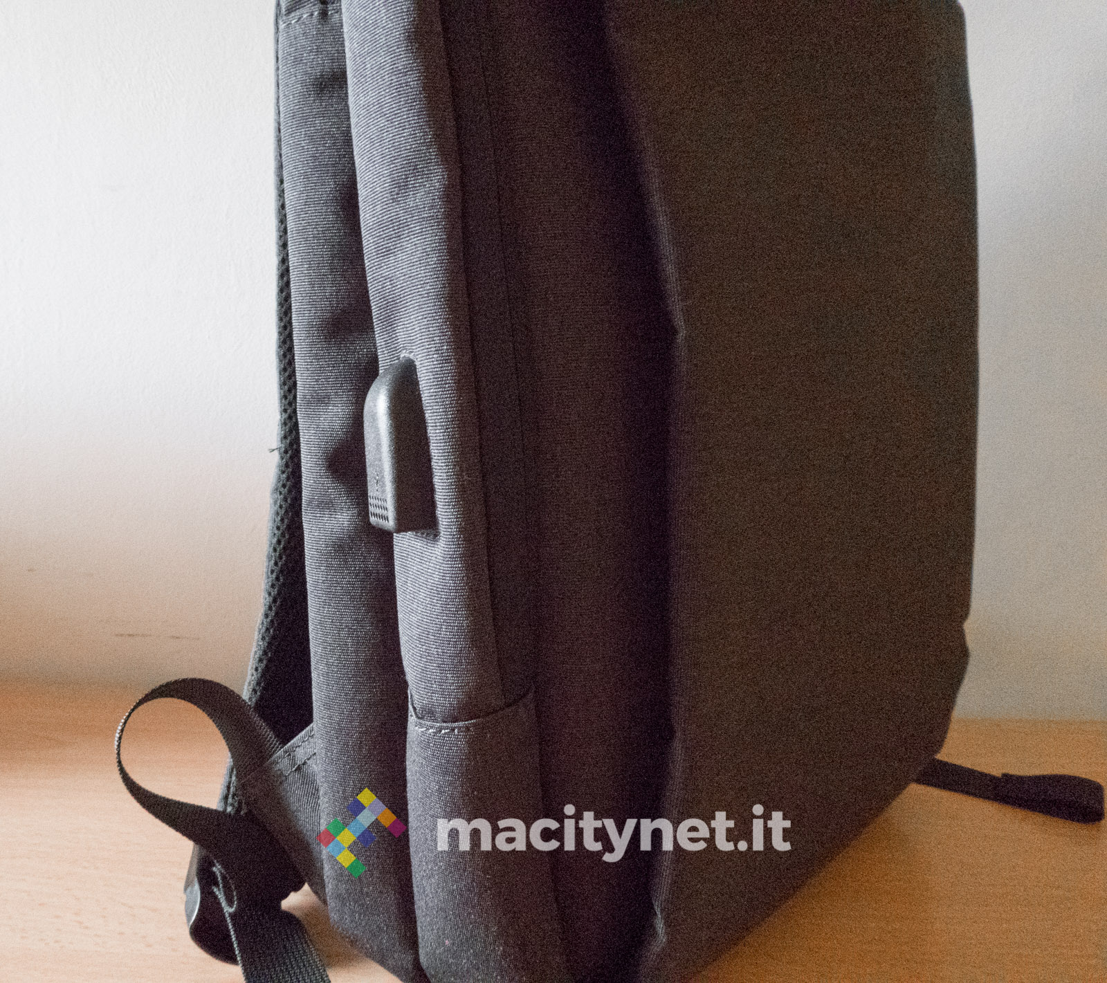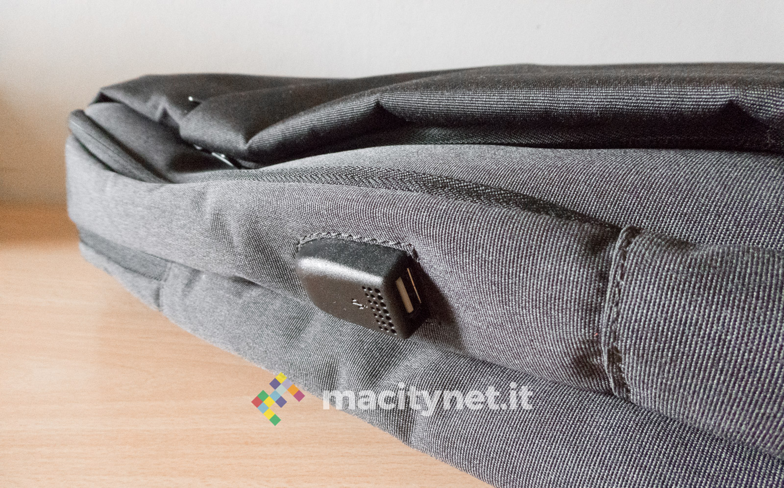 Una delle funzioni più apprezzate e che effettivamente contraddistinguono questo zaino consiste nella presa USB esterna. Sul lato sinistro praticamente spunta un cilindro in plastica alla cui base è incassata una porta USB-A (la scelta di rivolgerla verso il basso la protegge da acqua e polvere). Questa presa è collegata ad un cavo lungo circa 30 centimetri che spunta sul bordo laterale della tasca principale: all’estremità troviamo una spina USB-A che può (anzi, dovrebbe) essere collegata ad una power bank, in modo tale da sfruttare l’energia accumulata dalla batteria per ricaricare i dispositivi in mobilità senza doverla estrarre dallo zaino.