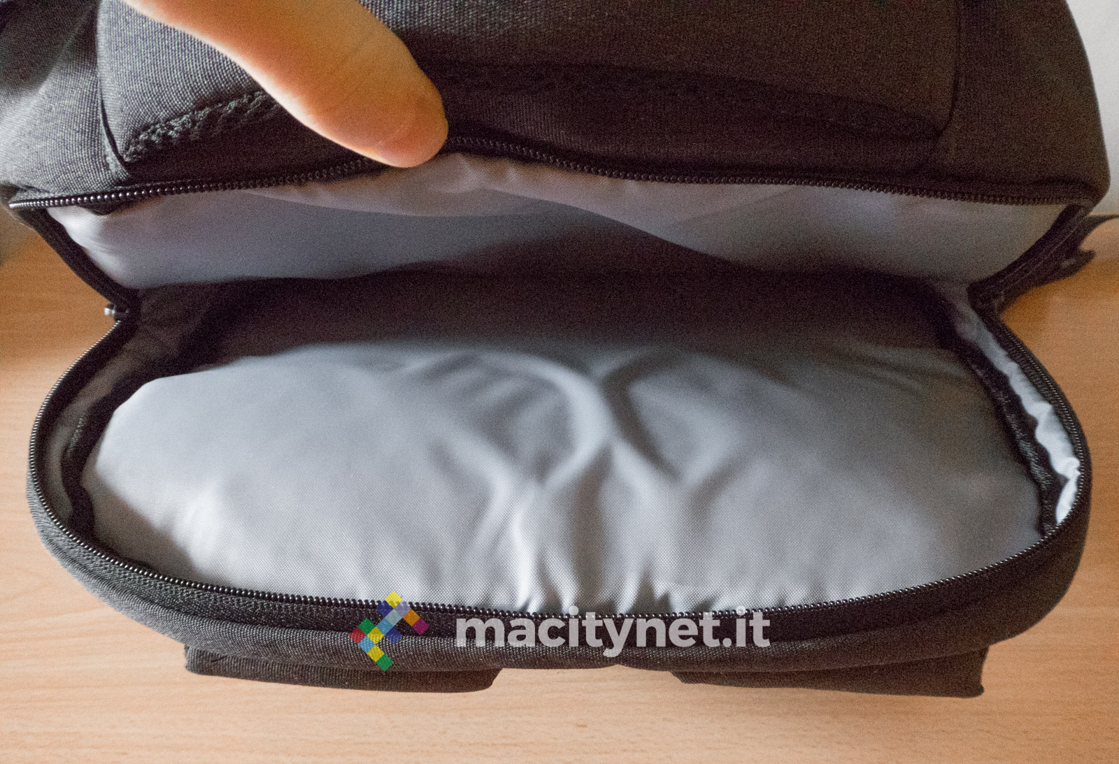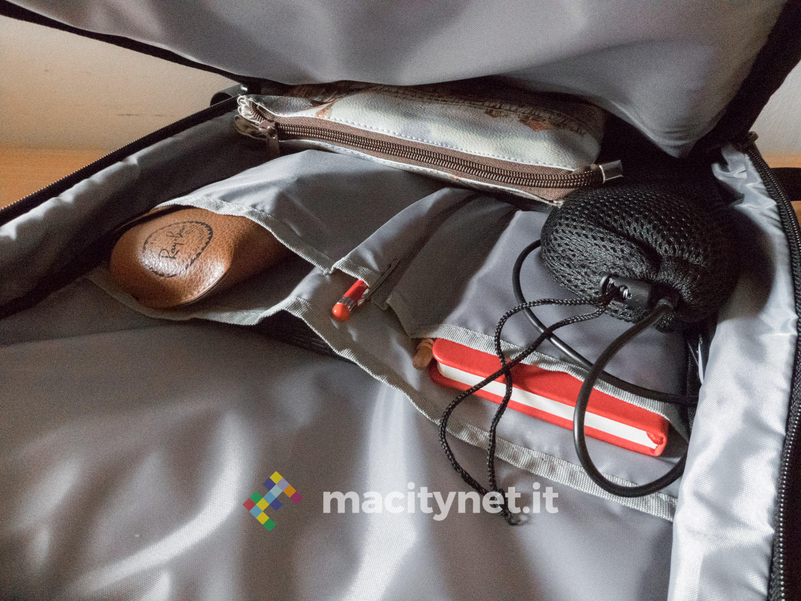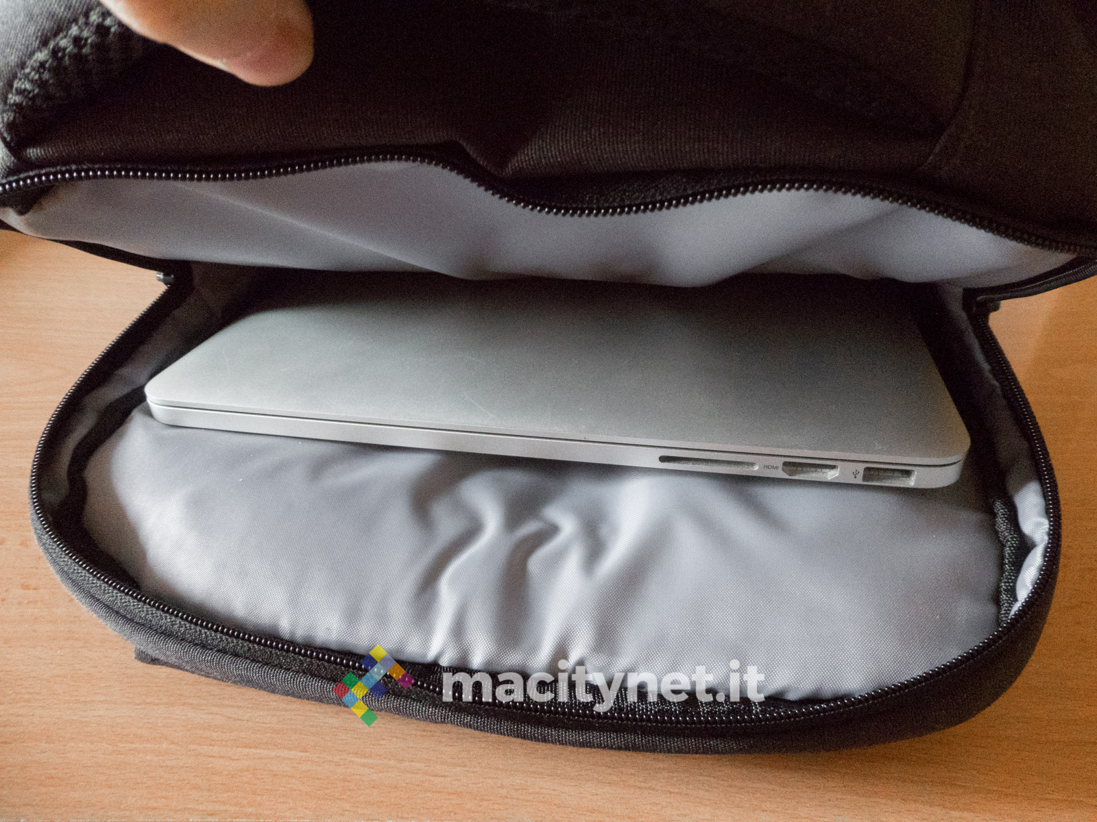 Nonostante risulti esteticamente molto sottile, c’è spazio per metterci davvero di tutto. Oltre ad essere ben distribuito, ci sono tasche di tutte le misure e messe ai punti giusti. Nello specifico abbiamo due tasche principali: la più vicina al dorso può contenere un computer portatile. Il produttore dice massimo 15.6 pollici ma noi crediamo che ci sia spazio anche per uno con schermo leggermente più grande, visto che il nostro MacBook Pro 15’’ entra benissimo e avanza molto spazio sia sopra che ai lati.