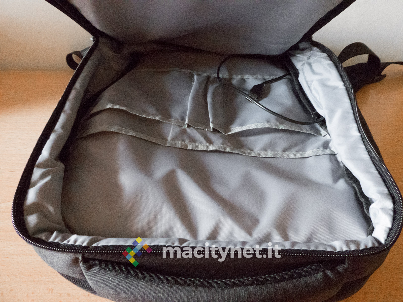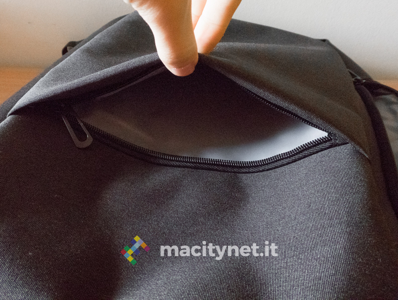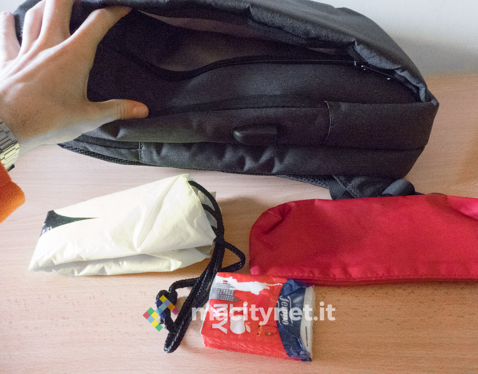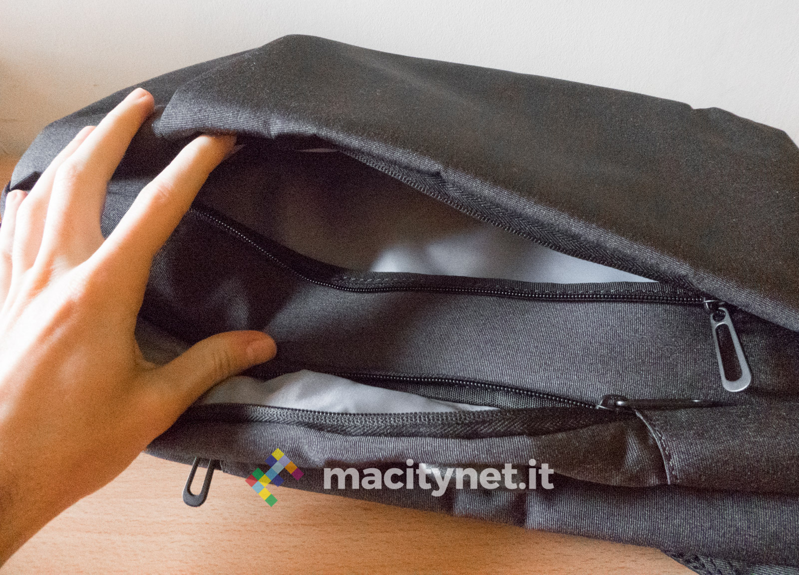 Nonostante risulti esteticamente molto sottile, c’è spazio per metterci davvero di tutto. Oltre ad essere ben distribuito, ci sono tasche di tutte le misure e messe ai punti giusti. Nello specifico abbiamo due tasche principali: la più vicina al dorso può contenere un computer portatile. Il produttore dice massimo 15.6 pollici ma noi crediamo che ci sia spazio anche per uno con schermo leggermente più grande, visto che il nostro MacBook Pro 15’’ entra benissimo e avanza molto spazio sia sopra che ai lati.