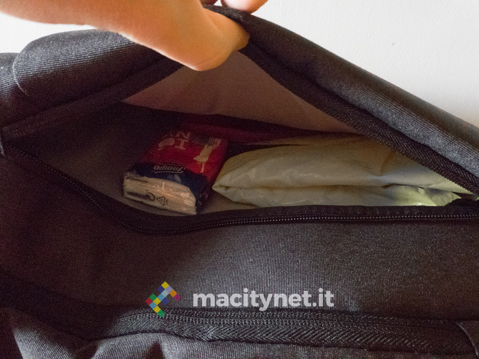 L’altra tasca, che potremmo definire La tasca principale, si trova invece dalla parte opposta della maniglia ed al suo interno ha spazio per tantissimi altri oggetti. Su uno dei due lati ci sono infatti altre tre tasche che permettono di distribuire meglio il contenuto. Ad esempio, spesso utilizziamo una di queste tasche per tenere a portata di mano una Moleskine, nell’altra invece infiliamo una fotocamera compatta (in foto abbiamo messo il portafogli perché stavamo usando la fotocamera per scattare le fotografie). Quella più grande si può usare per tenere un tablet, oppure un paio di occhiali da sole o qualsiasi altra cosa. C’è molto spazio anche per altri oggetti, oppure per una felpa o una bottiglia d’acqua da mezzo litro.