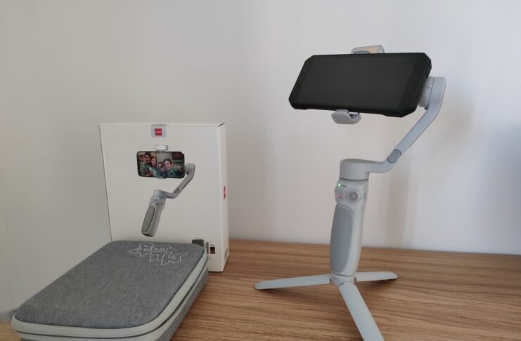 Come già anticipato, la confezione contiene anche un treppiede, che consentirà di piazzare il gimbal su un piano, ottimo anche per i vlogger, che potranno lasciare il gimbal in posizione su una scrivania, facendosi inquadrare automaticamente grazie alla funzione di tracciamento, di cui parleremo più avanti.