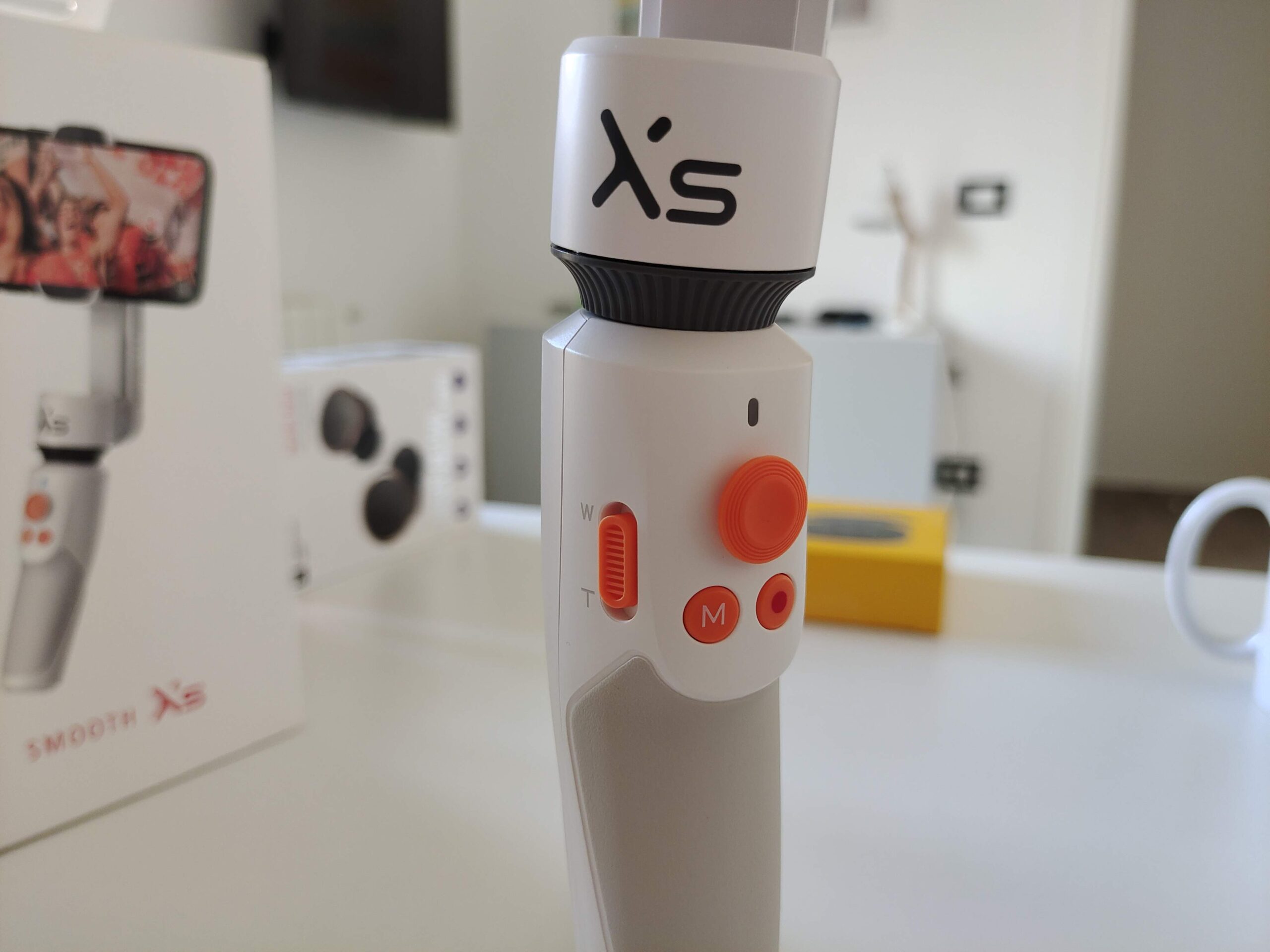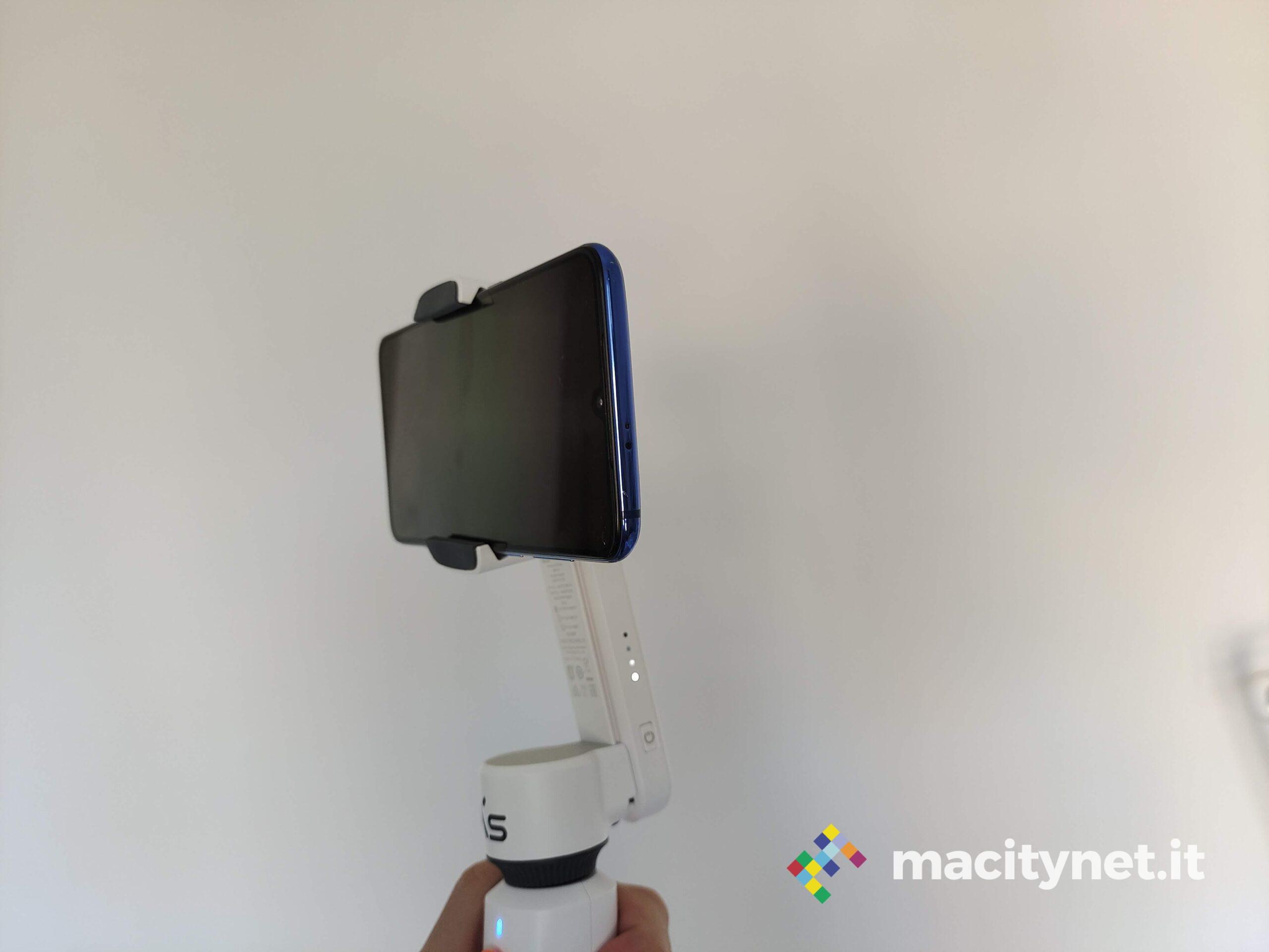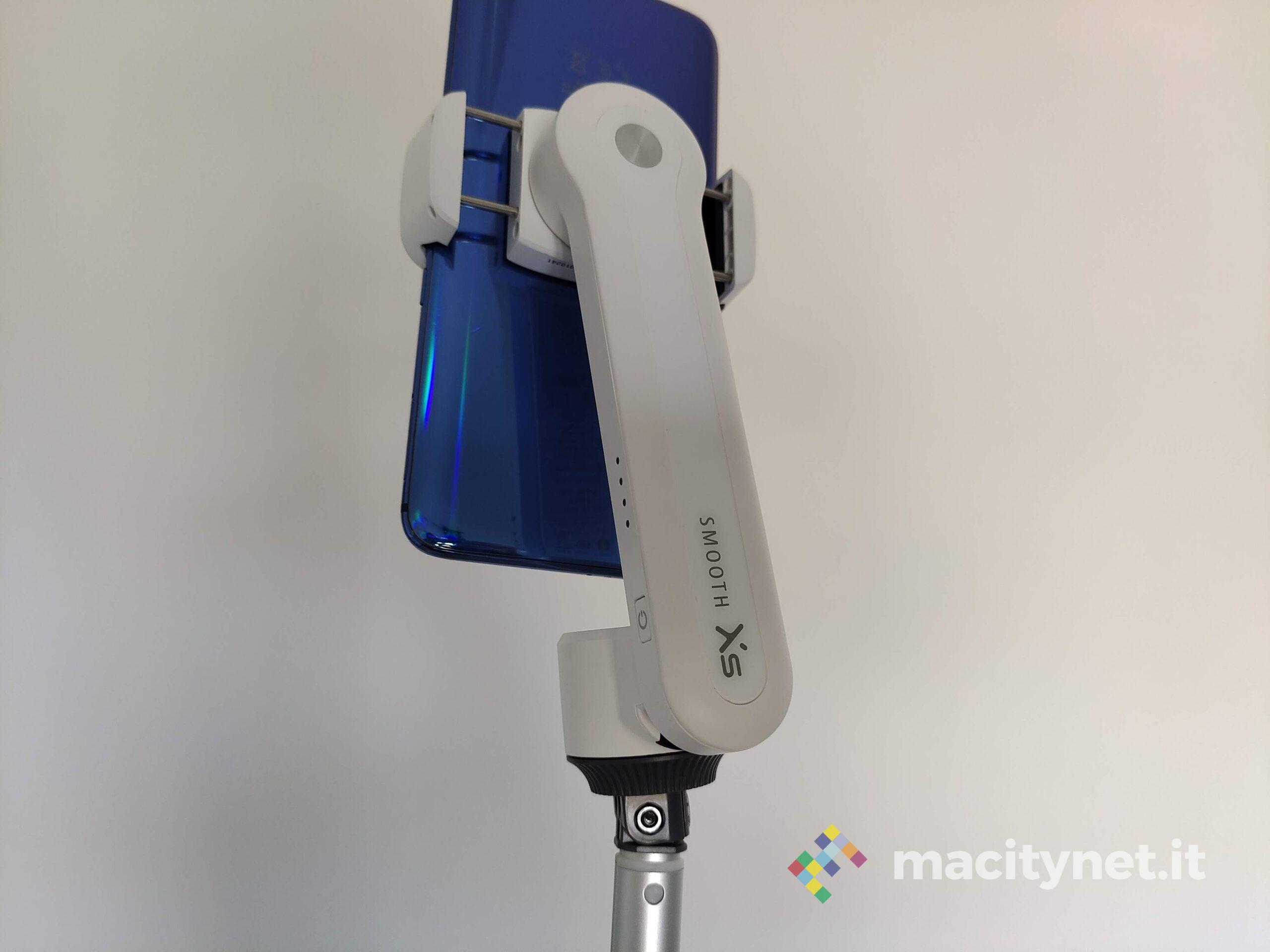 Nel manico sono presenti i pulsanti di scatto, o avvio registrazione, uno stick analogico per muovere lo smartphone sul piano orizzontale, o anche per muoverlo in obliquo. Ancora, è presente un pulsante per effettuare il lock dello smartphone su un punto, e anche per passare con un doppio click dalla modalità landscape a quella portrait. Infine, è presente uno slider per gestire lo zoom.