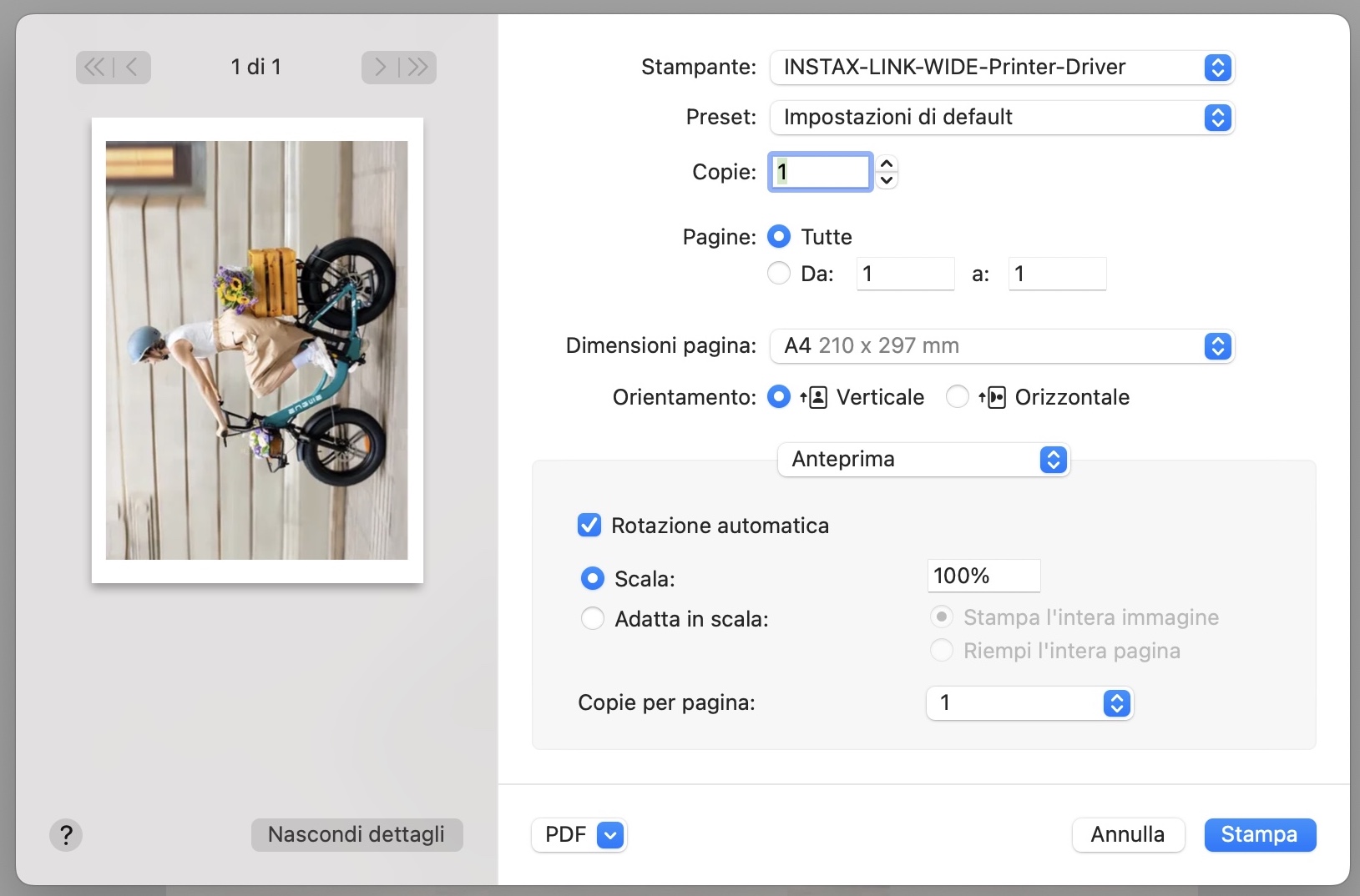 Tecnologia di stampa: sviluppo chimico instax (microcapsule nella pellicola), senza inchiostro o cartucce.