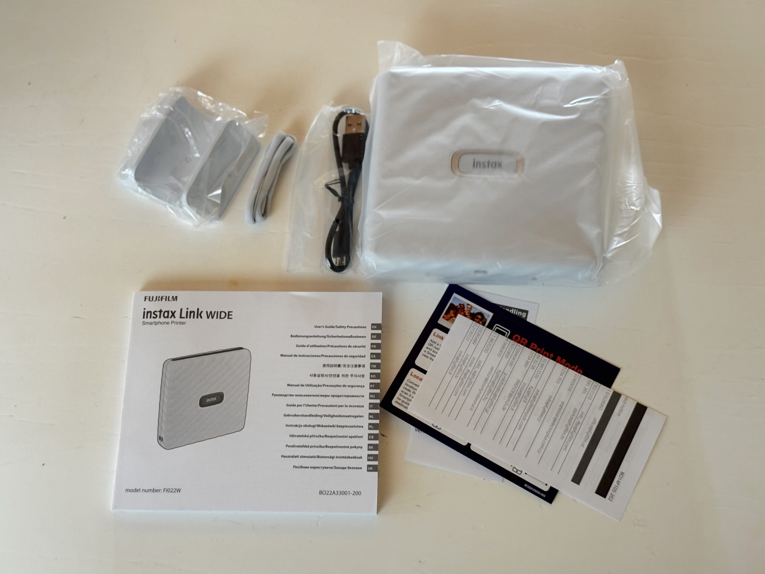 La Fujifilm instax Link WIDE arriva in una confezione essenziale ma ben organizzata. All’interno troviamo la stampante, il cavo USB per la ricarica e la documentazione di base. Nessuna pellicola o “carta di stampa” inclusa: dovrete pensarci da subito se è un regalo o qualcosa da usare al volo.