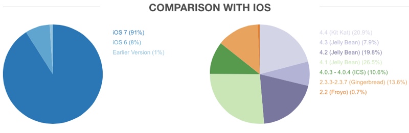 Le profonde divergenze con iOS emergono ancora più marcate osservando la percentuale di diffusione delle versioni. Nel mondo Apple il 91% degli utenti di iPhone e iPad sta utilizzando l’ultima versione disponibile iOS 7. Solo l’8% usa un dispositivo con installato iOS 6 mentre le versioni precedenti contano per meno dell’uno per cento. Questa situazione si contrappone a quella di Android dove le versioni principalmente in uso sono ben 6. Primo è Android 4.1 Jelly Bean con il 26,5%, seguito da 4.4 Kit Kat che è la versione più recente con solamente il 20,9% seguito a sua volta da Android 4.2 con il 19,8%, Gingerbread con il 13,6% infine Ice Cream Sandwich con il 10,6%.