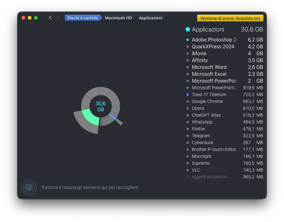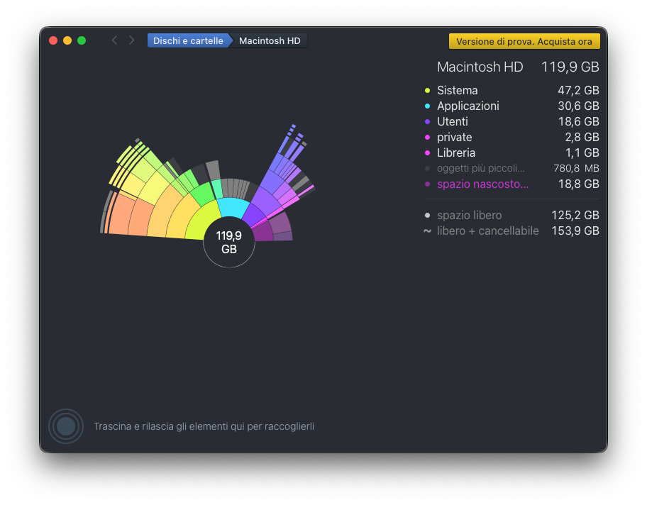 Una delle utility più comode e semplici per capire da cosa è occupato lo spazio su disco si chiama DaisyDisk. SI scarica da qui, è a pagamento ma può essere testata gratuitamente. Nel momento in cui scriviamo il requisito minimo è macOS 10.13 e lo sviluppatore mette a disposizioni versioni più vecchie (compatibile con le precedenti versioni del sistema operativo).