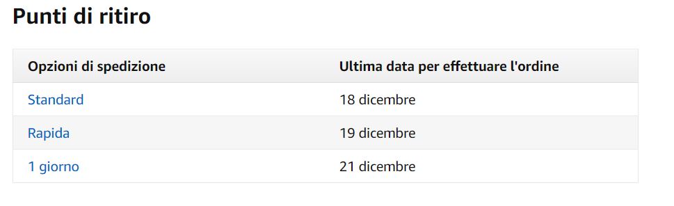 Se invece di scegliere la modalità di consegna a casa, siete disposti a ritirare il vostro regalo presso un Punto di Ritiro Amazon (si può trovare e selezionare il punto di ritiro durante il processo di acquisto, quando si sceglie l’indirizzo di spedizione), le date entro cui ordinare per la consegna entro Natale sono leggermente differenti. L’acquisto entro il 18 dicembre sarà disponibile al punto di ritiro entro Natale con spedizione standard. L’acquisto entro il 19 richiede la spedizione Rapida, mentre l’acquisto il 21 Dicembre richiede la spedizione 1 giorno per arrivare al punto di ritiro prescelto.