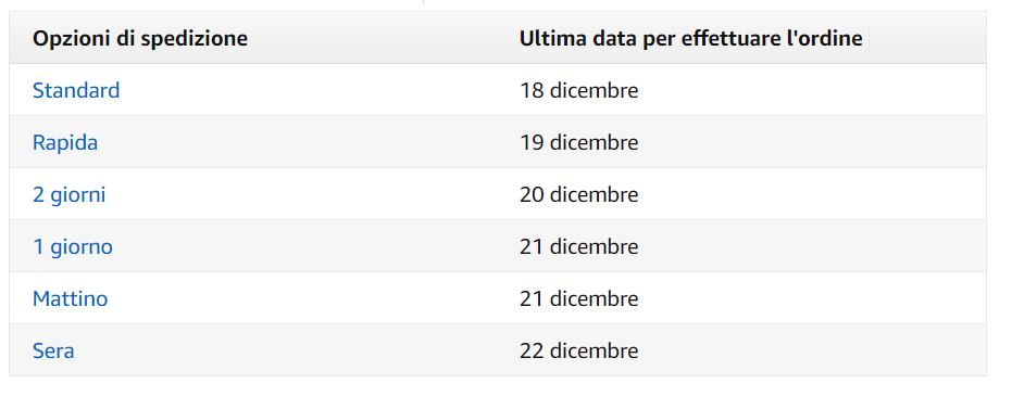 Per ricevere il proprio regalo Amazon entro Natale, da oggi in dovrete avere l’accortezza di inserire come modalità di spedizione quella Rapida, gratis per tutti gli utenti iscritti ad Amazon Prime, da 3,90 a 5 euro per i non utenti Prime. Se acquistate il vostro regalo di Natale su Amazon il 20 dicembre, invece, sarà necessario scegliere la spedizione 2 giorni per poterlo ottenere entro Natale: anche questa è gratis per tutti gli utenti Prime, costa invece 5,99 euro per gli utenti standard. Anche il 21 dicembre si fa ancora in tempo ad ordinare su Amazon e ricevere il regalo entro Natale, purché si scelga la spedizione 1 giorno: costa 8 euro, ed è gratis per li utenti Amazon Prime. Se ordinate, invece, il 22 dicembre, l’unica opzione che consentirà di ricevere il regalo entro Natale sarà quella “Sera”, valida però nella sola zona di Milano. Ha un costo di 10 euro per spedizione, più 4 euro per ogni articolo incluso nell’ordine. Per gli iscritti ad Amazon Prime la spedizione “Sera” costa 6,99 euro per articolo. E’ disponibile esclusivamente per ordini effettuati nell’area di Milano nei giorni feriali, da lunedì a venerdì, per ordini entro le ore 13:30. Questa opzione di spedizione non può essere utilizzata per le consegne nelle caselle postali degli uffici postali.