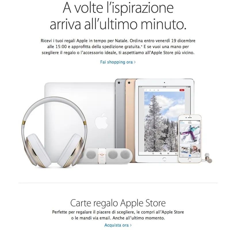 Si tratta però delle ultime ore: l’avviso arriva da Apple stessa tramite email inviate ad alcuni utenti. Per l’acquisto dei regali su Apple Store online è possibile effettuare ordinazioni fino alle ore 15 di domani, venerdì 19 dicembre. Successivamente a questa scadenza è sempre possibile effettuare acquisti ma Apple non assicura che invio e ricezione possano avvenire in tempo per Natale, per questa ragione occorre osservare con attenzione le date di consegna visualizzate durante la fase di chekup e pagamento. Ricordiamo che in questi giorni acquistando prodotti per un importo superiore a 40 euro la spedizione è gratuita.