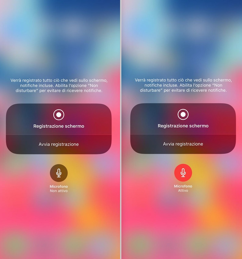 A questo punto premete con forza (se avete a disposizione 3D touch), oppure premete senza rilasciare, il tasto di registrazione. Apparirà un sotto menù, che prima di consentire l’inizio delle riprese, permetterà all’utente di mantenere attivo, o meno, il microfono. In questo modo, prima di iniziare la registrazione dello schermo, sarà possibile decidere se registrare anche l’audio, o meno.