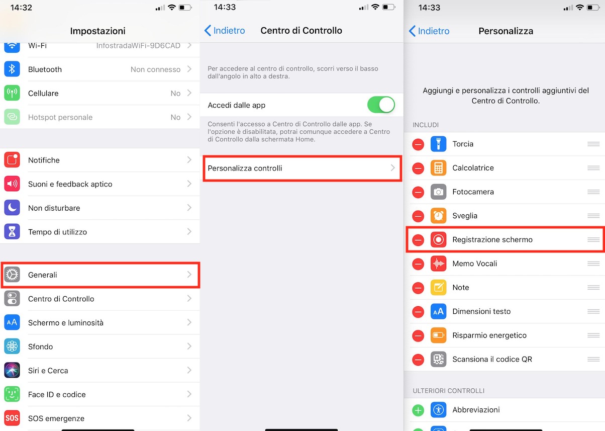 La prima cosa da fare è quella di inserire all’interno del Centro di Controllo, la relativa opzione. Per farlo è sufficiente andare su Impostazioni, Generali, Centro di Controllo, Personalizza controlli e, da qui, cliccare sul “più” verde accanto alla voce Registrazione schermo.