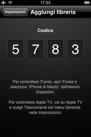 Questo piccolo applicativo che occupa solo 1 MB è in grado di trasformare iPhone e iPod touch (aggiornato) in telecomandi perfetti per controllare tutte le funzioni e i contenuti di iTunes, siano essi sul nostro Mac e anche su Apple TV. Una volta installato l’applicativo occorre associare Remote a una libreria iTunes: l’operazione è semplicissima e completamente automatica. Tutto quello che occorre fare è leggere il codice numerico che appare sullo schermo di iPhone o touch, per poi inserirlo all’interno della finestra che appare su iTunes nel Mac o in Apple TV.