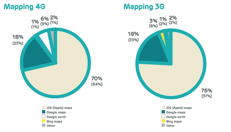 “Il traffico sulle nuove mappe di Apple rappresenta oggi il 70% del traffico per applicazioni di mappe sulla rete 4G, in crescita dal 60% nel secondo semestre del 2013, rubando quote di mercato da Google Maps, che è sceso di 7 punti percentuali. Questa differenza è ancora più marcata sulle reti 3G dove Apple Maps è cresciuto di 19 punti percentuali e Google Maps è sceso di 15 punti percentuali”.