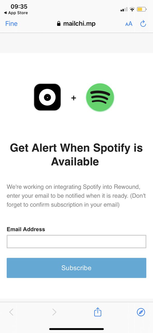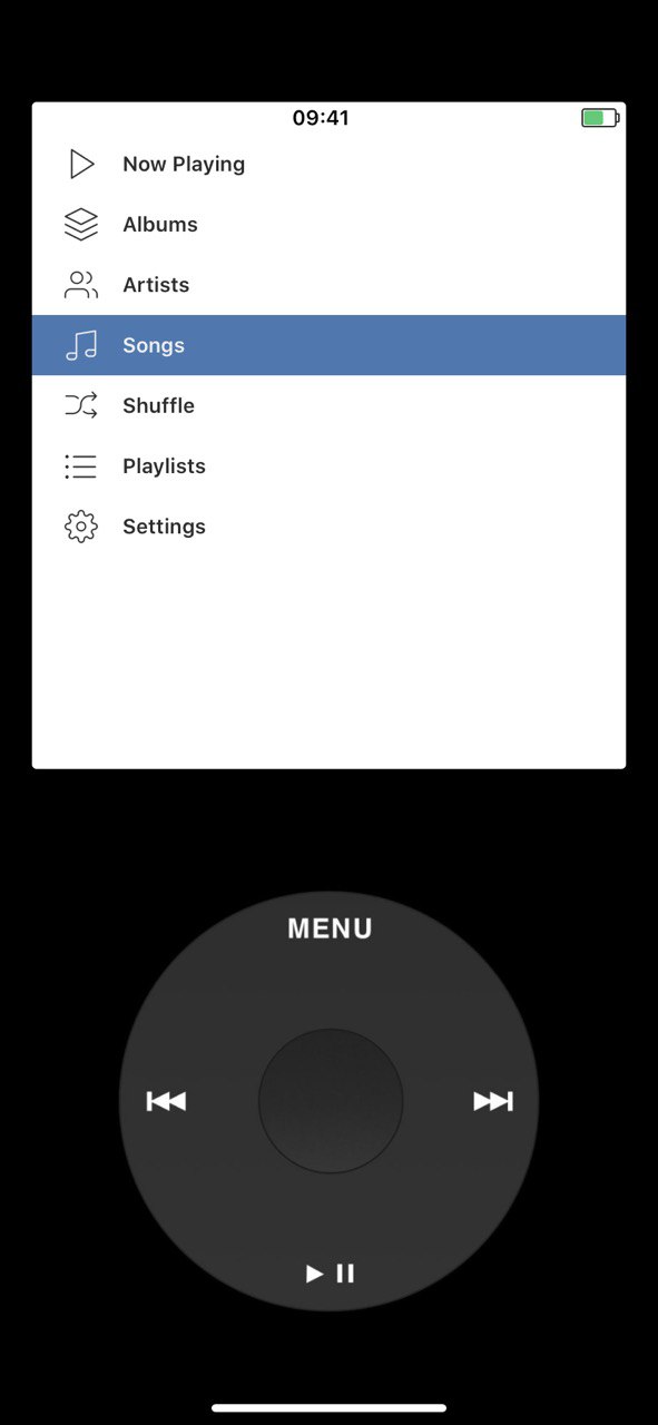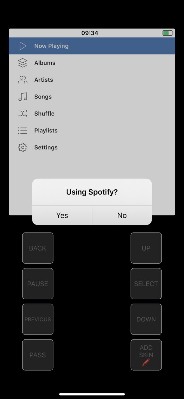 Per evitare che Rewound fosse respinta e avere una chanche in più di arrivare agli utenti, l’app non contiene la skin grafica che ricrea in tutto e per tutto il frontale di iPod Classic. Infatti una volta scaricata e installata mostra in alto il classico elenco di cartelle per gestire la musica tra In riproduzione, Playlist, Album, Artisti, Brani e altro, mentre in basso appare un grande riquadro nero con la scritta Custom Interface.